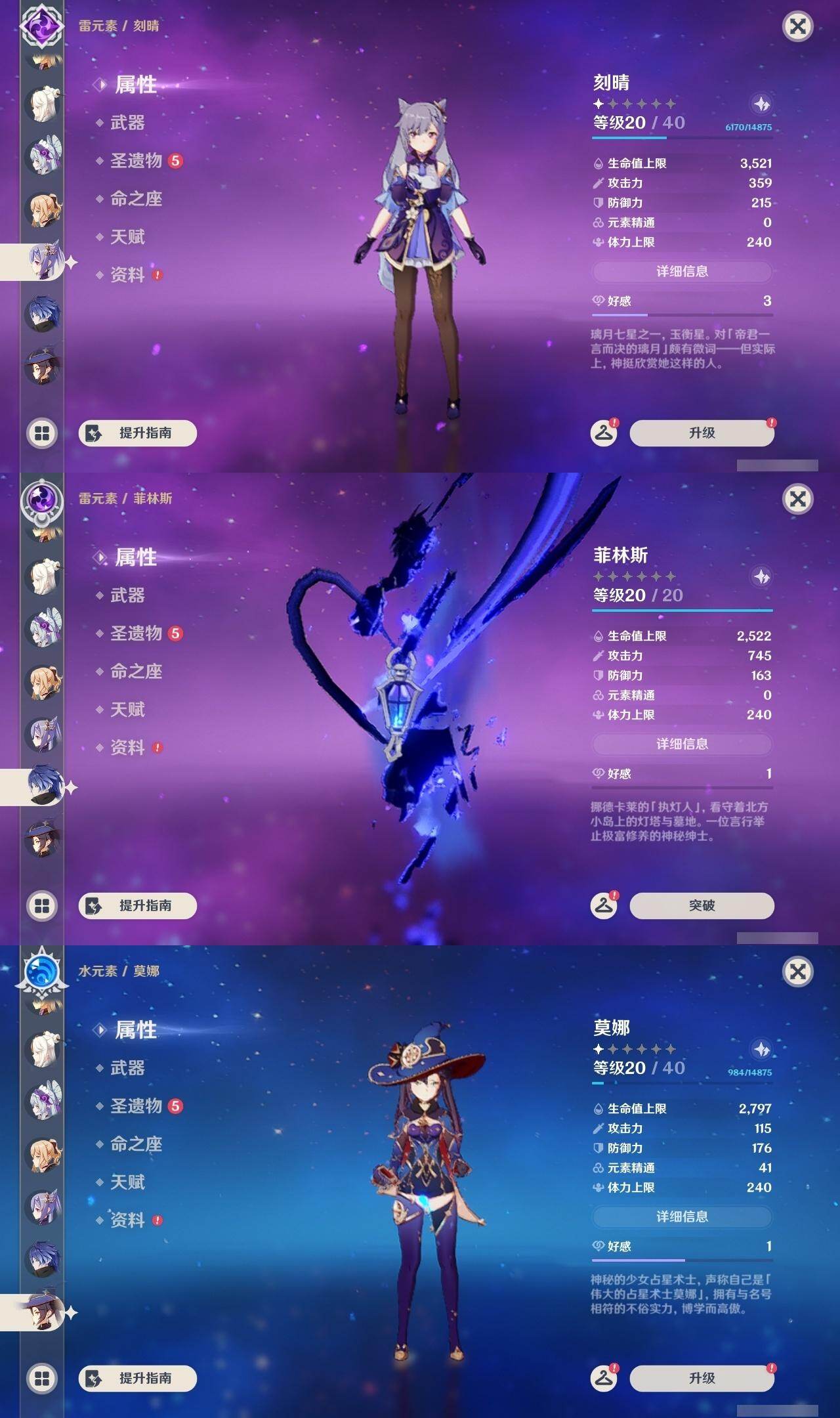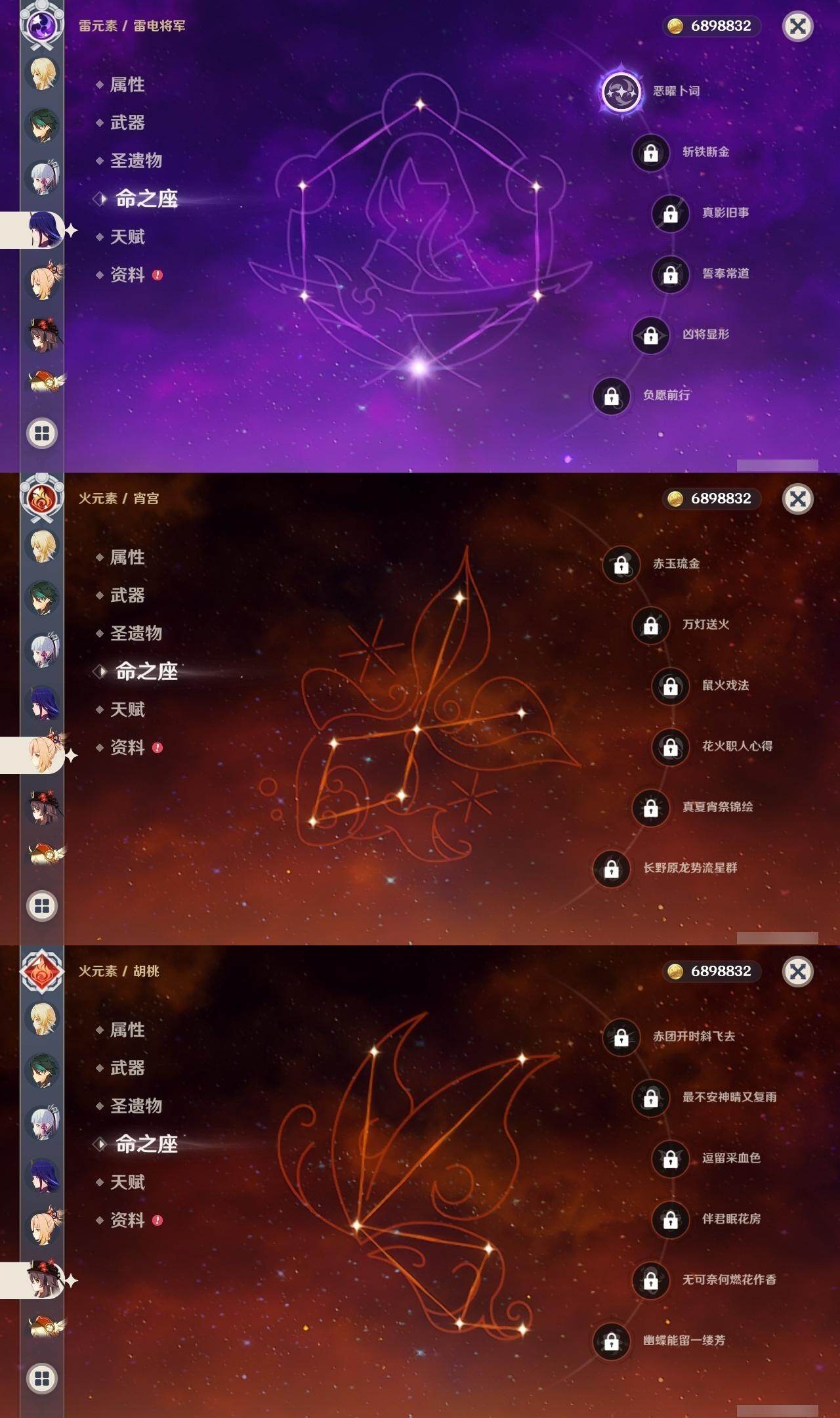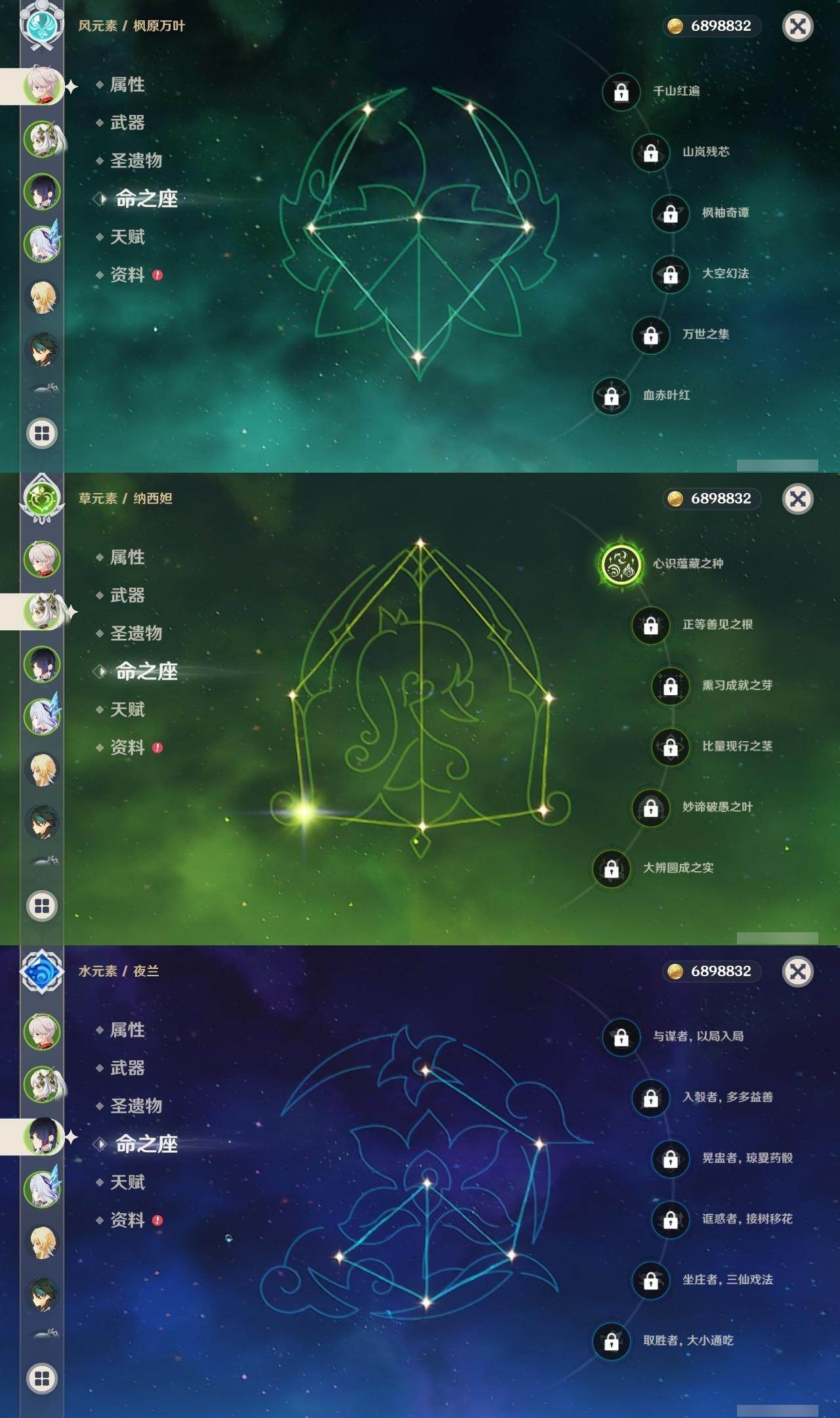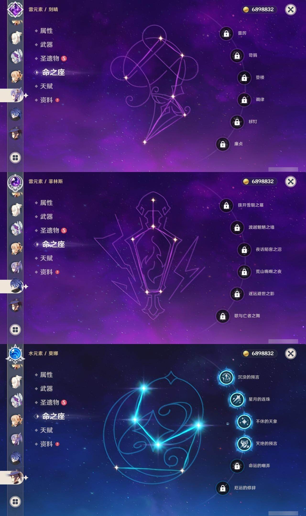 0命芙宁娜,1命纳西妲,0命夜兰,1命雷电将军,0命枫原万叶,0命神里绫华,0命胡桃,0命魈,0命宵宫,0命温迪,0命可莉,0命刻晴,3命七七,1命琴,4命莫娜,0命梦见月瑞希,0命丝柯克,0命菲林斯,精1雾切之回光,精1和璞鸢,精1天空之刃