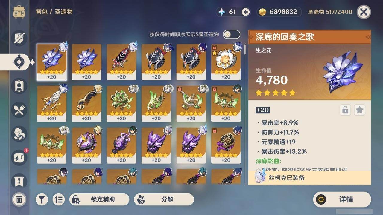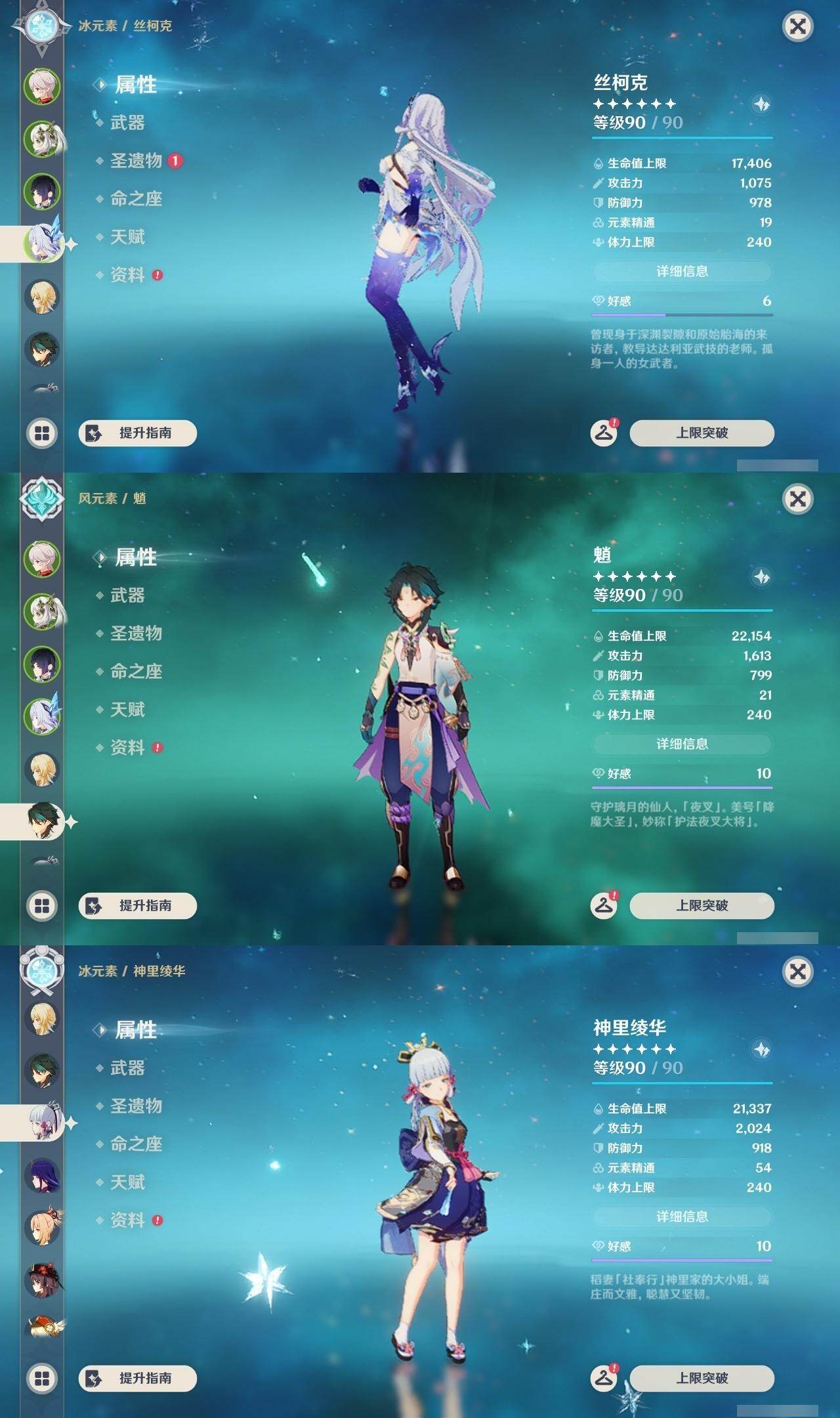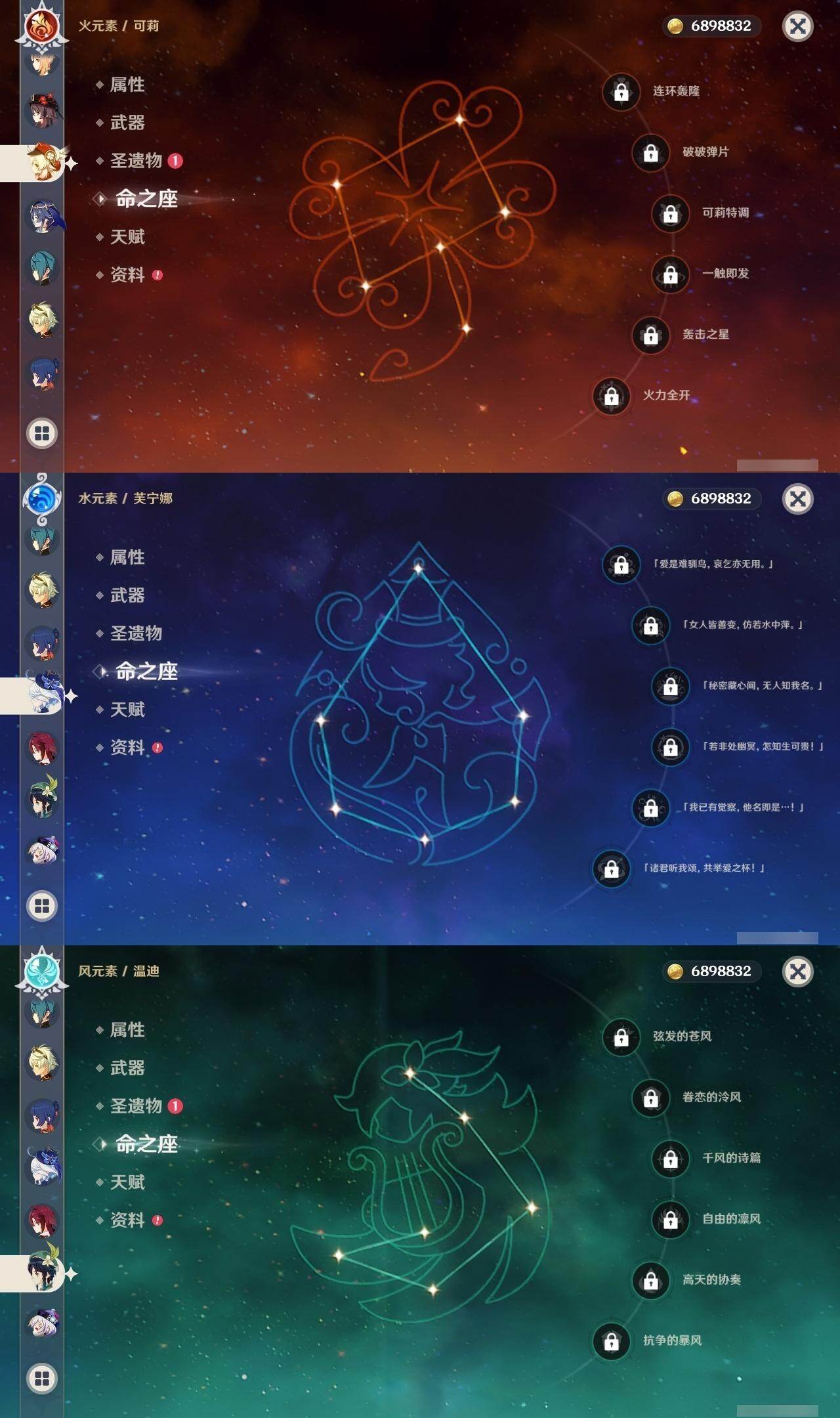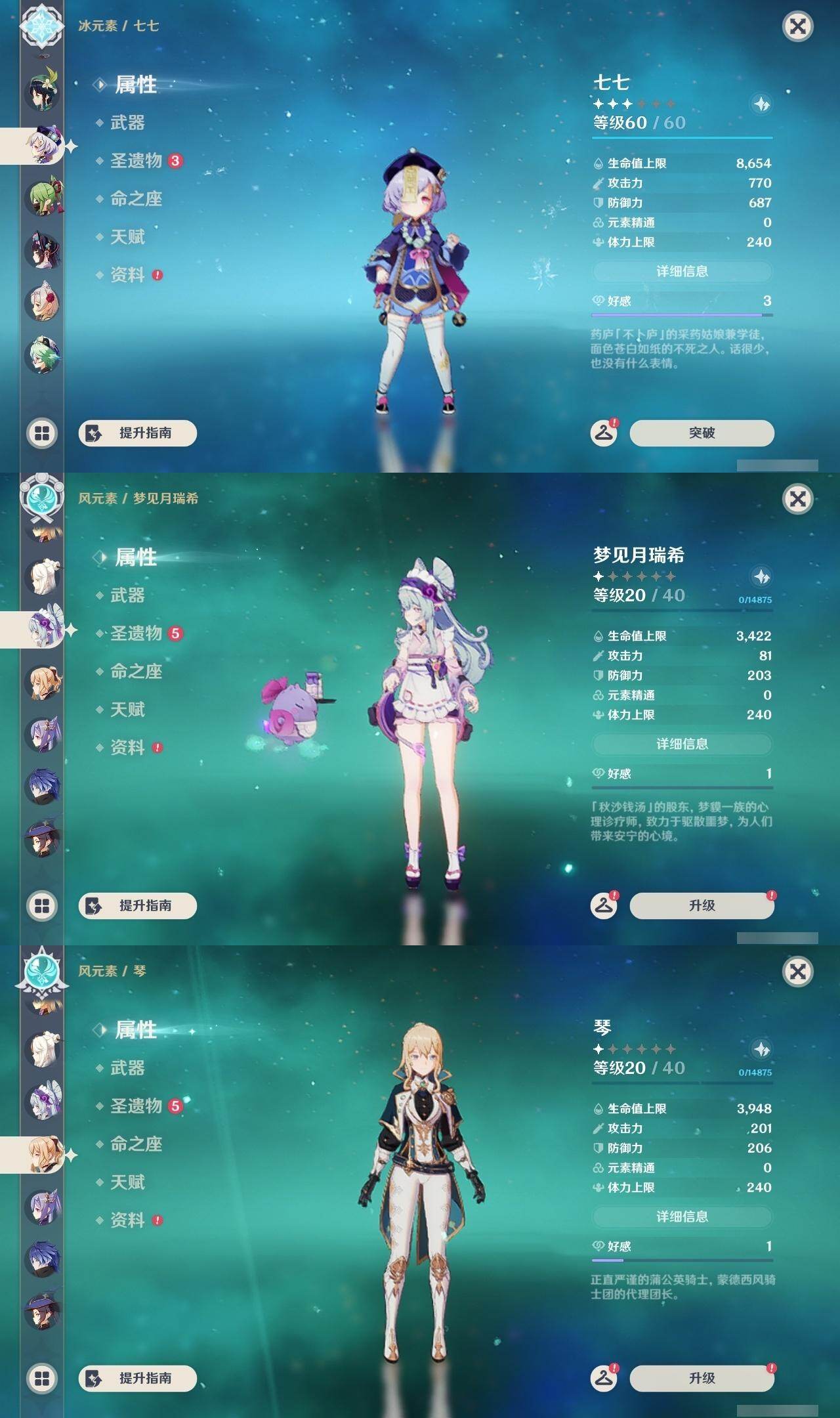 0命芙宁娜,1命纳西妲,0命夜兰,1命雷电将军,0命枫原万叶,0命神里绫华,0命胡桃,0命魈,0命宵宫,0命温迪,0命可莉,0命刻晴,3命七七,1命琴,4命莫娜,0命梦见月瑞希,0命丝柯克,0命菲林斯,精1雾切之回光,精1和璞鸢,精1天空之刃