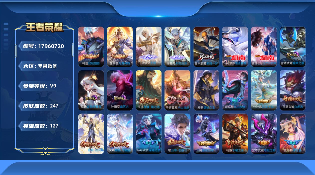 [17960720]苹果WX-V9-至尊星耀II段位-127英雄-247皮肤-2典藏皮肤-2无双-3珍品传说-38传说-70史诗连体和平2粉9枪都市深海小丑鱼