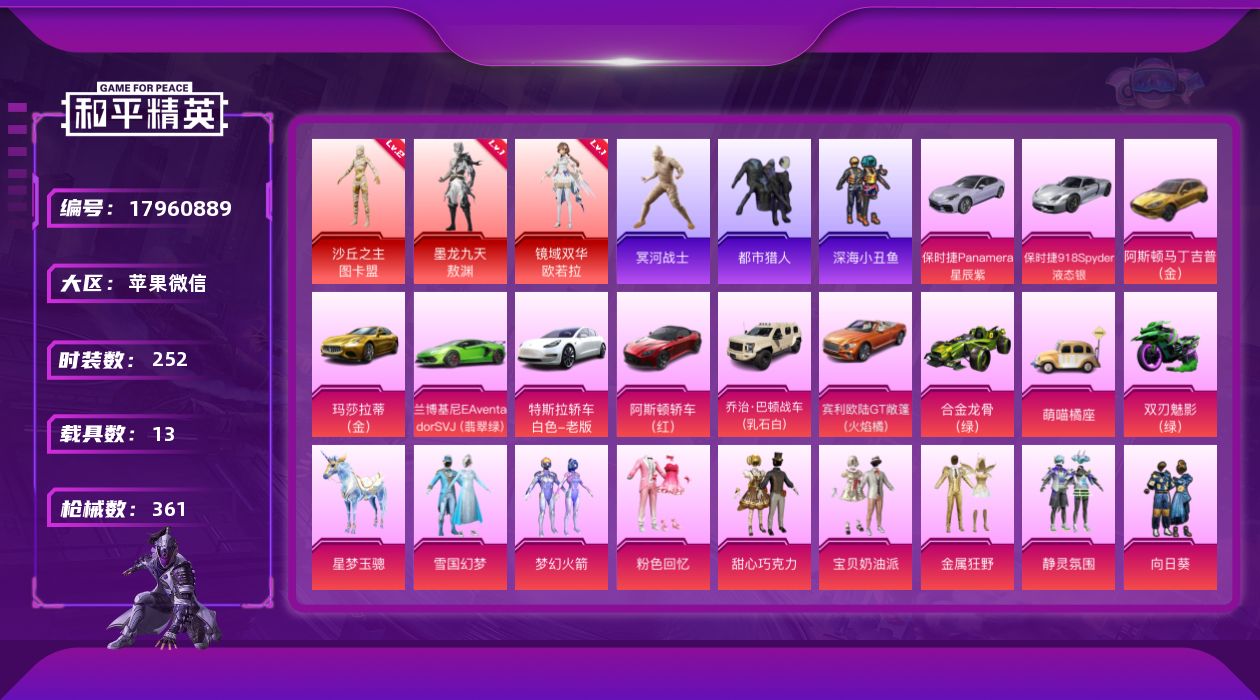 苹果 微信-无敌战神框-3神装-32粉装-30特效枪-14载具-13粉色飞行器-168128热力值-22王牌印记-252套装-361枪皮