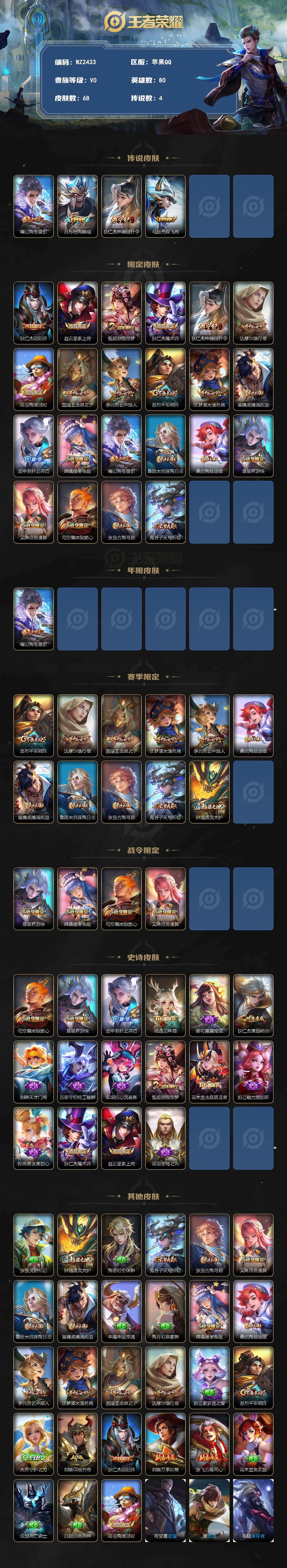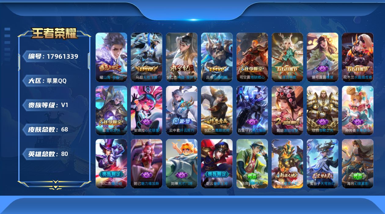 [17961339]苹果Q-68皮肤-4传说-16史诗 【传说皮肤】:曜山海苍雷引,吕布怒海麟威,狄仁杰神器狴犴令,马超无双飞将 【限定皮肤】:狄仁杰阴阳师,赵云皇家上将,甄姬游园惊梦,狄仁杰魔术师,狄仁杰神器狴犴令,达摩沙漠行僧,项羽海滩派对,兰陵王金庭之子,李元芳云中旅人,苏烈千军破阵,沈梦溪大漠名商,裴擒虎擒涛扼浪,云中君纤云弄巧,嫦娥暖冬兔眠,曜山海苍雷引,鲁班大师探海日志,桑启海盐诗旅,暃星界游侠,艾琳流音漫舞,司空震地狱燃心,张良古海寻踪,鬼谷子天穹祈灯 【年限皮肤】:曜山海苍雷引 【赛季限定】:苏烈千军破阵,达摩沙漠行僧,兰陵王金庭之子,沈梦溪大漠名商,李元芳云中旅人,桑启海盐诗旅,裴擒虎擒涛扼浪,鲁班大师探海日志,张良古海寻踪,鬼谷子天穹祈灯,钟馗虚灵犬护 【战令限定】:暃星界游侠,嫦娥暖冬兔眠,司空震地狱燃心,艾琳流音漫舞 【史诗皮肤】:司空震地狱燃心,暃星界游侠,云中君纤云弄巧,瑶遇见神鹿,娜可露露晚萤,狄仁杰鹰眼统帅,刘禅天才门将,百里守约特工魅影,安琪拉心灵骇客,甄姬游园惊梦,花木兰水晶猎龙者,妲己魅力维加斯,孙尚香水果甜心,狄仁杰魔术师,赵云皇家上将,项羽苍穹之光 【其他皮肤】:张良灵野札记,钟馗虚灵犬护,海诺时空谍影,鬼谷子天穹祈灯,张良古海寻踪,艾琳流音漫舞,鲁班大师探海日志,裴擒虎擒涛扼浪,牛魔牛运亨通,海月幻泉雾影,嫦娥暖冬兔眠,桑启海盐诗旅,李元芳云中旅人,沈梦溪大漠名商,兰陵王金庭之子,达摩沙漠行僧,妲己紫罗兰之誓,苏烈千军破阵,大乔守护之力,刘备汉昭烈帝,狄仁杰阴阳师,刘备万事如意,张飞五福同心,花木兰兔女郎,亚瑟死亡骑士,白起白色死神,项羽海滩派对,司空震启蛰,澜孤猎,马超幸存者,瑶森,元歌午夜歌剧院,百里玄策威尼斯狂欢,百里守约绝影神枪,诸葛亮星航指挥官,杨戬埃及法老,苍维京掠夺者,马可波罗激情绿茵,虞姬加勒比小姐,李元芳特种部队,孙悟空西部大镖客,小乔万圣前夜,曹操超能战警,王昭君精灵公主,老夫子潮流仙人,花木兰剑舞者,项羽帝国元帅,鲁班七号福禄兄弟 【营地ID】:1804247489