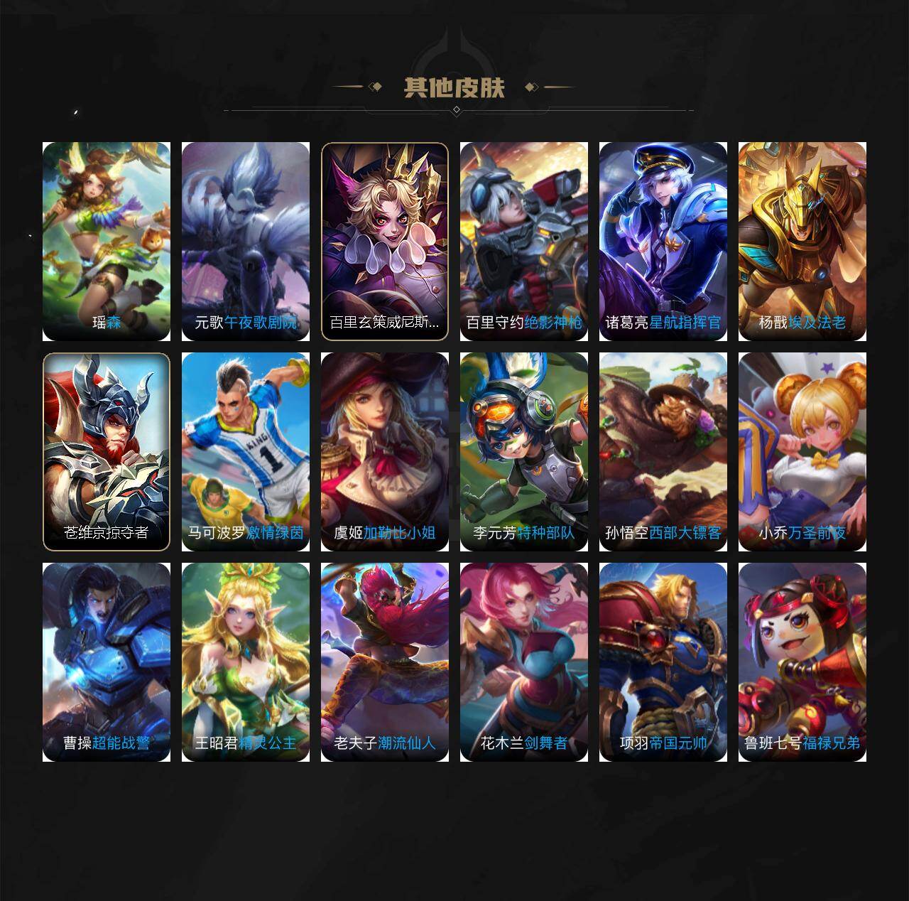 【其他皮肤】:张良灵野札记,钟馗虚灵犬护,海诺时空谍影,鬼谷子天穹祈灯,张良古海寻踪,艾琳流音漫舞,鲁班大师探海日志,裴擒虎擒涛扼浪,牛魔牛运亨通,海月幻泉雾影,嫦娥暖冬兔眠,桑启海盐诗旅,李元芳云中旅人,沈梦溪大漠名商,兰陵王金庭之子,达摩沙漠行僧,妲己紫罗兰之誓,苏烈千军破阵,大乔守护之力,刘备汉昭烈帝,狄仁杰阴阳师,刘备万事如意,张飞五福同心,花木兰兔女郎,亚瑟死亡骑士,白起白色死神,项羽海滩派对,司空震启蛰,澜孤猎,马超幸存者,瑶森,元歌午夜歌剧院,百里玄策威尼斯狂欢,百里守约绝影神枪,诸葛亮星航指挥官,杨戬埃及法老,苍维京掠夺者,马可波罗激情绿茵,虞姬加勒比小姐,李元芳特种部队,孙悟空西部大镖客,小乔万圣前夜,曹操超能战警,王昭君精灵公主,老夫子潮流仙人,花木兰剑舞者,项羽帝国元帅,鲁班七号福禄兄弟
