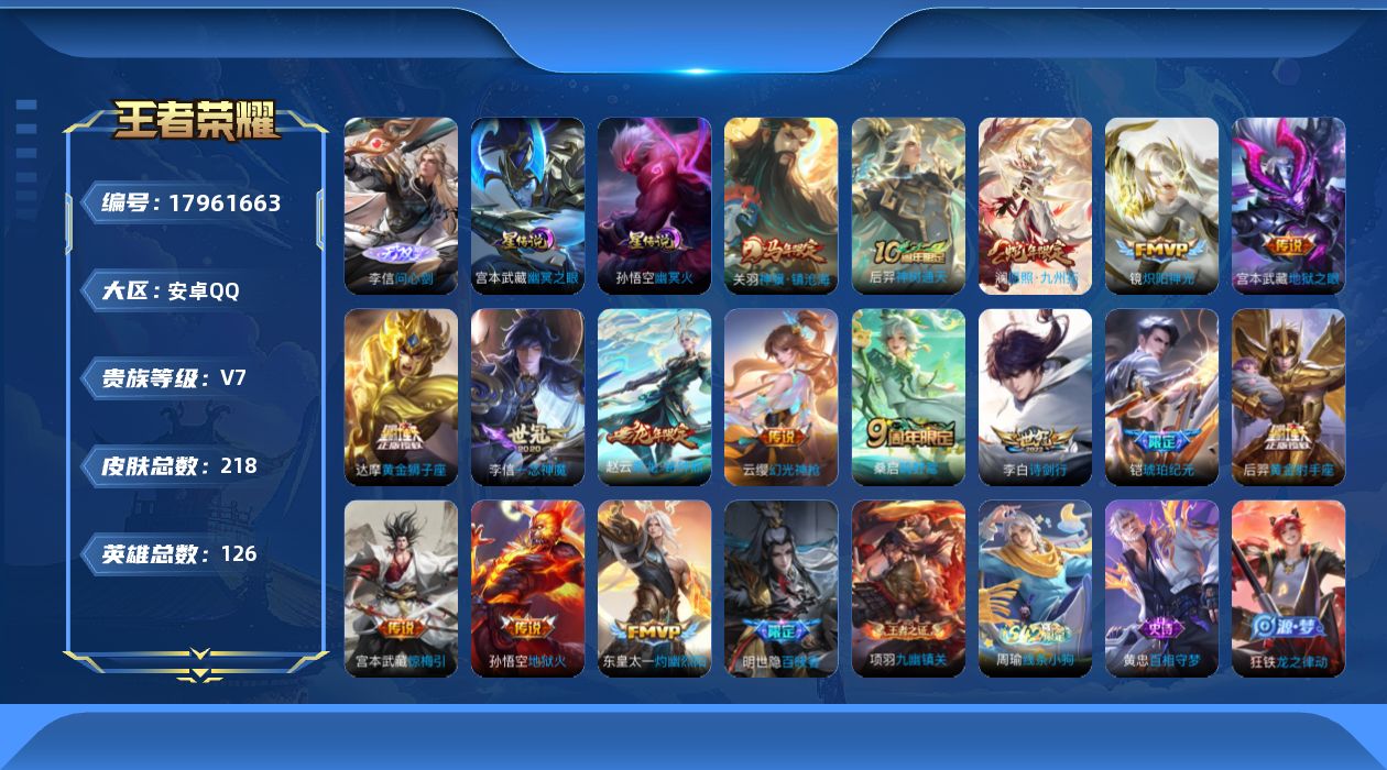 [17961663]安卓Q-218皮肤-1无双-16传说-57史诗 【无双皮肤】:李信问心剑 【传说皮肤】:关羽神骥镇沧海,后羿神树通天,澜愿照九州拓,云缨幻光神枪,桑启鸣野蒿,赵云乘龙铭钟鼎,铠琥珀纪元,宫本武藏惊梅引,东皇太一灼幽烈阳,李白诗剑行,镜炽阳神光,李信一念神魔,达摩黄金狮子座,后羿黄金射手座,宫本武藏地狱之眼,孙悟空地狱火 【限定皮肤】:蒙犽顽岩魄,姜子牙天穹之誓,杨戬破阵退雄兵,狄仁杰阴阳师,赵云皇家上将,庄周高山流水,芈月幻夜卜梦,元歌无心,典韦岱宗,狄仁杰魔术师,项羽海滩派对,孙悟空至尊宝,孙悟空孙行者,李元芳云中旅人,干将莫邪胡桃夹子,鬼谷子五谷丰年,沈梦溪大漠名商,裴擒虎李小龙,裴擒虎擒涛扼浪,云中君纤云弄巧,嫦娥拒霜思,鲁班大师探海日志,桑启海盐诗旅,艾琳女武神,艾琳流音漫舞,司空震地狱燃心,阿古朵江河有灵,张良古海寻踪,蒙犽百解令,高渐离燃音魔法,妲己灵卜魔法,鬼谷子天穹祈灯,铠琥珀纪元,赵云乘龙铭钟鼎,沈梦溪龙舞盛年,鲁班七号蔬乡物语,李元芳蔬乡物语,刘邦剑破天穹,程咬金群星魔术团,镜青焰无极,项羽苍威无极,刘备异域游侠,周瑜熔金海岸 【年限皮肤】:典韦岱宗,赵云乘龙铭钟鼎,澜愿照九州拓 【赛季限定】:沈梦溪大漠名商,李元芳云中旅人,桑启海盐诗旅,裴擒虎擒涛扼浪,鲁班大师探海日志,张良古海寻踪,鬼谷子天穹祈灯,刘邦剑破天穹,姜子牙天穹之誓,东皇太一噬灭天穹,太乙真人谧流熔炉,钟馗虚灵犬护,亚瑟荣光之誓,牛魔星界战将,项羽九幽镇关 【战令限定】:芈月幻夜卜梦,司空震地狱燃心,艾琳流音漫舞,高渐离燃音魔法,妲己灵卜魔法,鲁班七号蔬乡物语,李元芳蔬乡物语,镜青焰无极,项羽苍威无极,周瑜线条小狗 【史诗皮肤】:明世隐百晓客,周瑜线条小狗,项羽九幽镇关,黄忠百相守梦,狂铁龙之律动,阿轲化蝶舞,牛魔星界战将,蒙犽顽岩魄,黄忠怒海争锋,镜青焰无极,鲁班七号蔬乡物语,高渐离燃音魔法,妲己灵卜魔法,蒙犽百解令,阿古朵江河有灵,司空震地狱燃心,刘禅电玩爆裂旋风,元歌无心,鬼谷子五谷丰年,嫦娥拒霜思,庄周高山流水,孙悟空孙行者,云中君纤云弄巧,裴擒虎李小龙,橘右京修罗,典韦岱宗,狄仁杰鹰眼统帅,阿轲节奏热浪,白起星夜王子,程咬金功夫厨神,李元芳逐浪之夏,刘禅天才门将,蔡文姬舞动绿茵,铠曙光守护者,百里守约特工魅影,安琪拉心灵骇客,雅典娜冰冠公主,亚瑟心灵战警,兰陵王暗隐猎兽