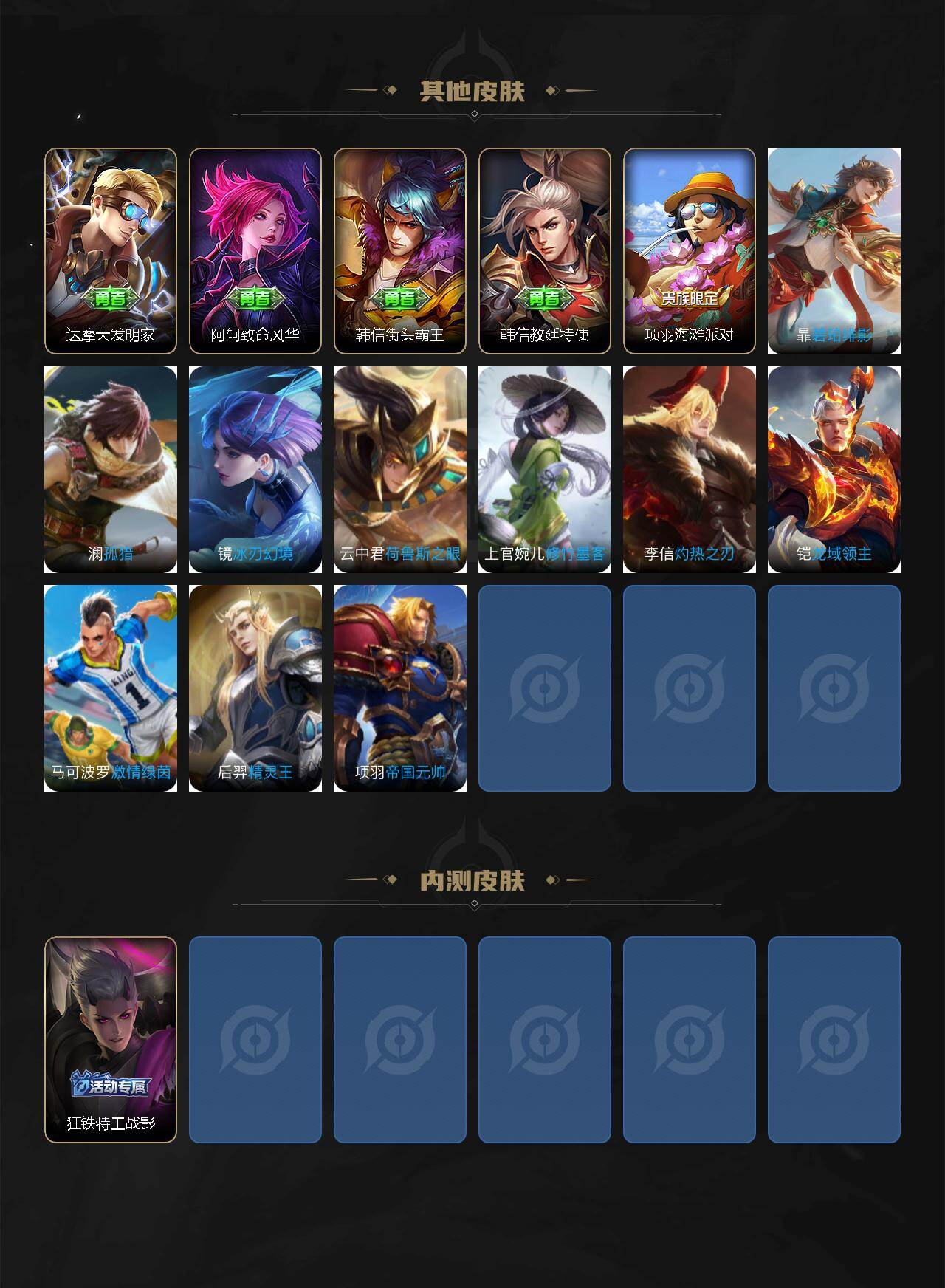 【其他皮肤】:蚩奼极光幻客,孙权径山谋武,大司命暗都幽影,海诺时空谍影,鬼谷子天穹祈灯,李元芳云中旅人,沈梦溪大漠名商,鲁班大师乓乓大师,鬼谷子原初探秘者,狂铁特工战影,老夫子醍醐杖,明世隐疑决卦,弈星混沌棋,盾山御銮,米莱狄御霄,狂铁御狮,王昭君幻想奇妙夜,太乙真人饕餮,白起狰,李元芳黑猫爱糖果,孙膑妖精王,庄周蜃楼王,狄仁杰阴阳师,后羿阿尔法小队,宫本武藏万象初新,亚瑟狮心王,亚瑟死亡骑士,妲己少女阿狸,扁鹊救世之瞳,赵云忍炎影,达摩大发明家,阿轲致命风华,韩信街头霸王,韩信教廷特使,项羽海滩派对,暃碧珀绯影,澜孤猎,镜冰刃幻境,云中君荷鲁斯之眼,上官婉儿修竹墨客,李信灼热之刃,铠龙域领主,马可波罗激情绿茵,后羿精灵王,项羽帝国元帅