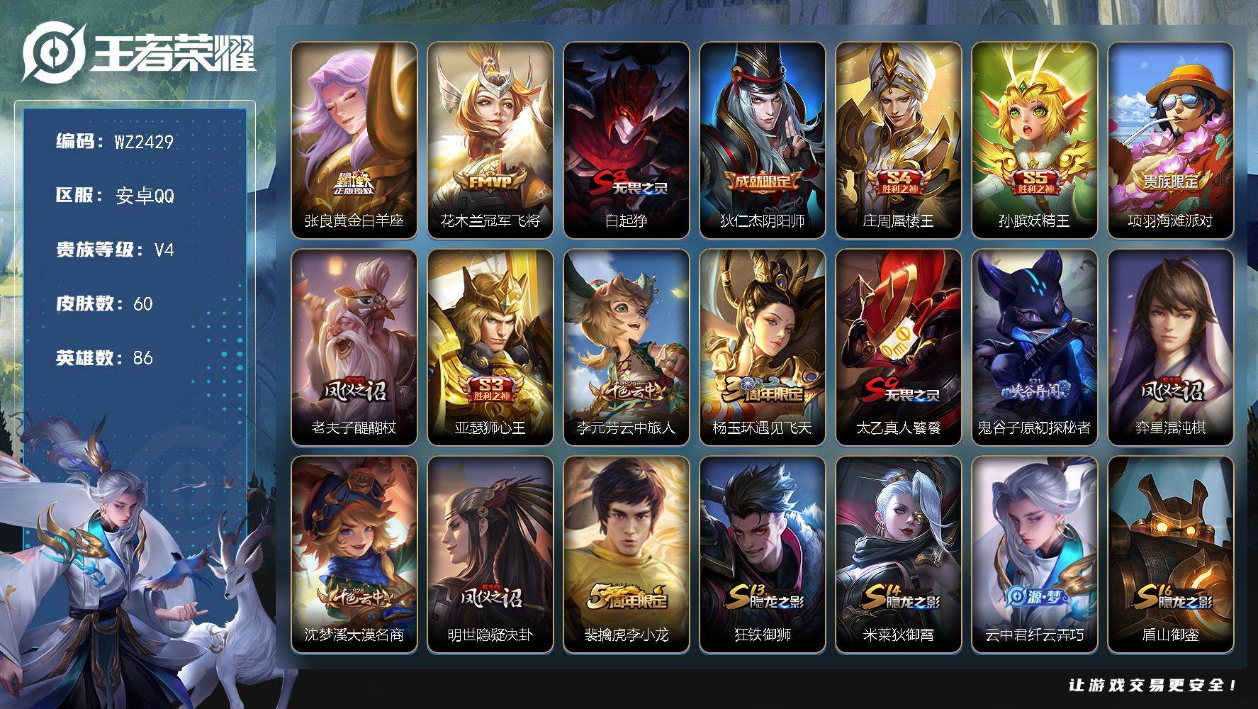 - [16363193]【特价急出/详情看图】安卓Q-V6-永恒钻石II段位-126英雄-272皮肤-1典藏皮肤-1星元-3传说-78史诗 【英雄全皮】:刘邦全皮,钟馗全皮,影全皮 【荣耀典藏】:李白鸣剑曳影 【传说皮肤】:李信山海炽霜斩,王昭君乞巧织情,狄仁杰超时空战士 【限定皮肤】:蔡文姬夏日便利店,虞姬夏日便利店,姜子牙天穹之誓,杨戬破阵退雄兵,狄仁杰阴阳师,赵云皇家上将,赵云龙胆,嬴政白昼王子,高渐离玩趣恶龙,阿轲迷踪丽影,芈月重明,吕布猎兽之王,周瑜赤莲之焰,元歌云间偶戏,夏侯惇朔风刀,典韦穷奇,典韦蓝屏警告,马可波罗暗影游猎,狄仁杰魔术师,达摩沙漠行僧,项羽海滩派对,程咬金演武夺筹,刘邦夺宝奇兵,韩信飞衡,兰陵王驯魔猎人,兰陵王金庭之子,亚瑟潮玩骑士王,孙悟空大圣娶亲,孙悟空孙行者,牛魔御旌,后羿如梦令,李元芳银河之约,李元芳云中旅人,钟馗神迹守卫,钟馗驱傩正仪,女娲朔望之晖,干将莫邪冰霜恋舞曲,雅典娜单词大作战,东皇太一逐梦之光,鬼谷子五谷丰年,苏烈千军破阵,百里玄策原初追逐者,弈星混沌棋,沈梦溪星空之诺,沈梦溪大漠名商,明世隐疑决卦,裴擒虎天狼狩猎者,裴擒虎李小龙,裴擒虎擒涛扼浪,米莱狄御霄,云中君纤云弄巧,云中君时之祈愿,李信山海炽霜斩,伽罗天狼溯光者,盾山御銮,嫦娥拒霜思,鲁班大师探海日志,桑启海盐诗旅,艾琳流音漫舞,司空震地狱燃心,阿古朵江河有灵,张良古海寻踪,高渐离燃音魔法,妲己灵卜魔法,鬼谷子天穹祈灯,姬小满妄想食味,沈梦溪龙舞盛年,鲁班七号蔬乡物语,李元芳蔬乡物语,刘邦剑破天穹,程咬金群星魔术团,镜青焰无极,项羽苍威无极,刘备异域游侠,周瑜熔金海岸 【年限皮肤】:韩信飞衡,李信山海炽霜斩 【赛季限定】:芈月重明,典韦穷奇,米莱狄御霄,牛魔御旌,盾山御銮,夏侯惇朔风刀,弈星混沌棋,明世隐疑决卦,程咬金演武夺筹,钟馗驱傩正仪,苏烈千军破阵,达摩沙漠行僧,兰陵王金庭之子,沈梦溪大漠名商,李元芳云中旅人,桑启海盐诗旅,裴擒虎擒涛扼浪,鲁班大师探海日志,张良古海寻踪,鬼谷子天穹祈灯,刘邦剑破天穹,姜子牙天穹之誓,东皇太一噬灭天穹,钟馗虚灵犬护,亚瑟荣光之誓,百里玄策原初追逐者,牛魔星界战将 【战令限定】:嬴政白昼王子,吕布猎兽之王,典韦蓝屏警告,女娲朔望之晖,钟馗神迹守卫,兰陵王驯魔猎人,周瑜赤莲之焰,李元芳银河之约,沈梦溪星空之诺,阿轲迷踪丽影,刘邦夺宝奇兵,马可波罗