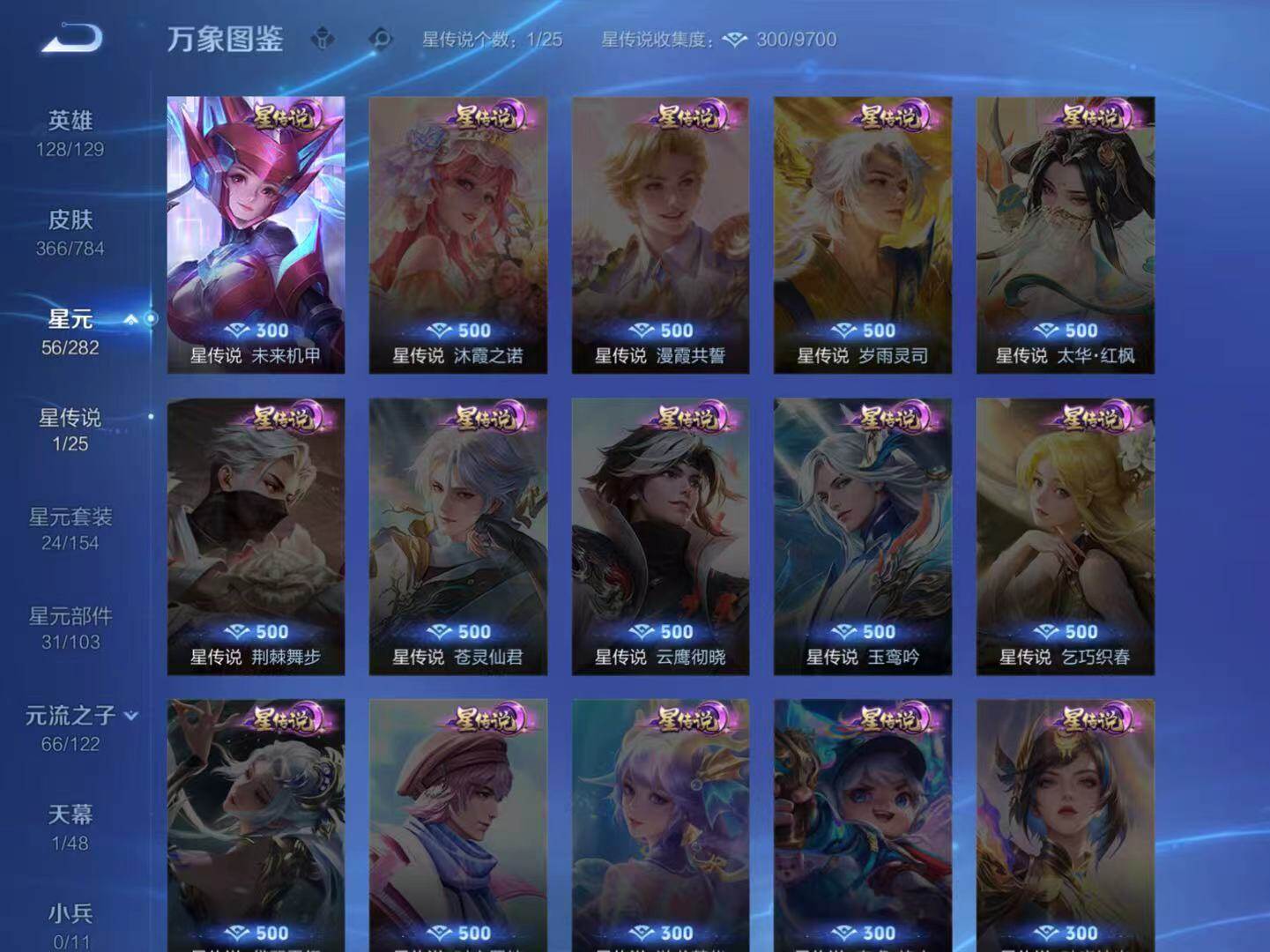 狂铁御狮,米莱狄御霄,盾山御銮,夏侯惇朔风刀,明世隐疑决卦,老夫子醍醐杖,鬼谷子原初探秘者,狄仁杰万华元夜,程咬金演武夺筹,钟馗驱傩正仪,苏烈千军破阵,元歌云间偶戏,弈星混沌棋,达摩沙漠行僧,兰陵王金庭之子,沈梦溪大漠名商,桑启海盐诗旅,裴擒虎擒涛扼浪,鲁班大师探海日志,张良古海寻踪,项羽苍威无极,镜青焰无极