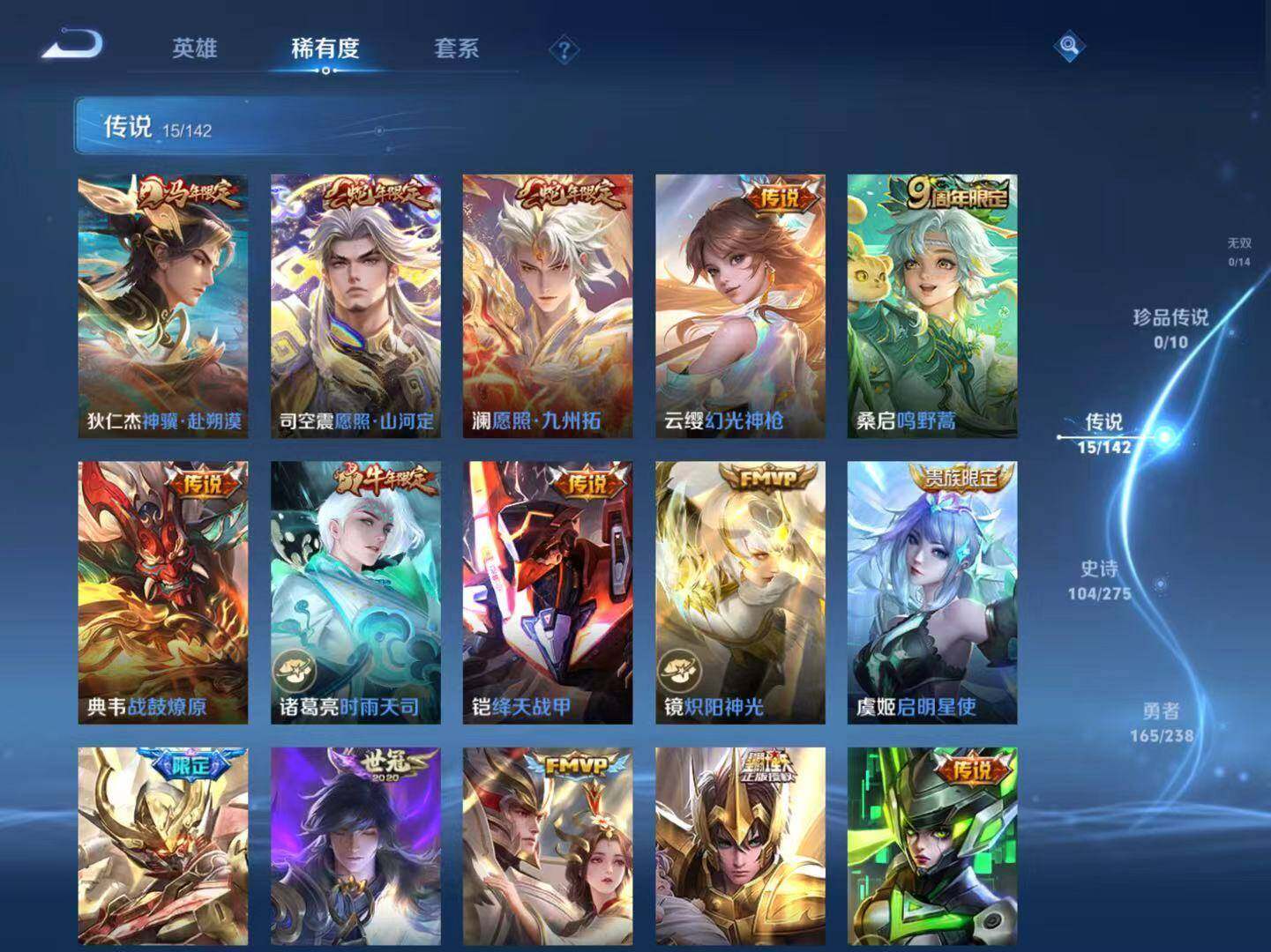 【传说皮肤】:狄仁杰神骥赴朔漠,司空震愿照山河定,澜愿照九州拓,云缨幻光神枪,桑启鸣野蒿,典韦战鼓燎原,诸葛亮时雨天司,铠绛天战甲,镜炽阳神光,虞姬启明星使,孙悟空零号赤焰,李信一念神魔,干将莫邪久胜战神,后羿黄金射手座,孙尚香末日机甲