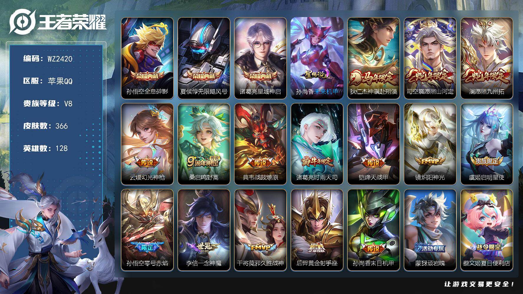 [17962597]苹果Q-V8-366皮肤-3典藏皮肤-15传说-103史诗 【英雄全皮】:孙权全皮,敖隐全皮 【荣耀典藏】:孙悟空全息碎影,夏侯惇无限飓风号,诸葛亮星域神启 【传说皮肤】:狄仁杰神骥赴朔漠,司空震愿照山河定,澜愿照九州拓,云缨幻光神枪,桑启鸣野蒿,典韦战鼓燎原,诸葛亮时雨天司,铠绛天战甲,镜炽阳神光,虞姬启明星使,孙悟空零号赤焰,李信一念神魔,干将莫邪久胜战神,后羿黄金射手座,孙尚香末日机甲 【限定皮肤】:蒙犽顽岩魄,蔡文姬夏日便利店,虞姬夏日便利店,姜子牙天穹之誓,李白谪仙醉月,狄仁杰阴阳师,赵云皇家上将,墨子神迹守卫,嬴政优雅恋人,鲁班七号乒乒小将,庄周高山流水,芈月幻夜卜梦,吕布御风骁将,元歌云间偶戏,夏侯惇朔风刀,甄姬落雪兰心,狄仁杰魔术师,狄仁杰万华元夜,达摩星际陆战队,达摩沙漠行僧,项羽海滩派对,老夫子醍醐杖,老夫子航海奇遇记,程咬金演武夺筹,韩信逐梦之影,兰陵王金庭之子,亚瑟潮玩骑士王,孙悟空零号赤焰,孙悟空孙行者,后羿圣弓游侠,虞姬霸王别姬,虞姬启明星使,钟馗驱傩正仪,干将莫邪真爱魔法,雅典娜单词大作战,雅典娜黎明之约,蔡文姬繁星吟游,鬼谷子原初探秘者,诸葛亮时雨天司,黄忠火炮绅士,苏烈千军破阵,弈星混沌棋,沈梦溪大漠名商,明世隐疑决卦,裴擒虎李小龙,裴擒虎擒涛扼浪,狂铁御狮,米莱狄御霄,米莱狄胡桃异想国,云中君纤云弄巧,伽罗天狼溯光者,盾山御銮,猪八戒猪悟能,上官婉儿梁祝,嫦娥拒霜思,嫦娥暖冬兔眠,鲁班大师探海日志,桑启海盐诗旅,暃星界游侠,艾琳女武神,艾琳流音漫舞,张良古海寻踪,蒙恬荣光圣徽,高渐离燃音魔法,妲己灵卜魔法,鬼谷子天穹祈灯,沈梦溪龙舞盛年,鲁班七号蔬乡物语,李元芳蔬乡物语,刘邦剑破天穹,程咬金群星魔术团,关羽决胜骁骑,镜青焰无极,项羽苍威无极,刘备异域游侠,芈月浮光幕影,周瑜熔金海岸 【年限皮肤】:诸葛亮时雨天司,吕布御风骁将,司空震愿照山河定,澜愿照九州拓 【赛季限定】:狂铁御狮,米莱狄御霄,盾山御銮,夏侯惇朔风刀,弈星混沌棋,明世隐疑决卦,老夫子醍醐杖,鬼谷子原初探秘者,狄仁杰万华元夜,程咬金演武夺筹,钟馗驱傩正仪,苏烈千军破阵,达摩沙漠行僧,兰陵王金庭之子,沈梦溪大漠名商,桑启海盐诗旅,裴擒虎擒涛扼浪,鲁班大师探海日志,张良古海寻踪,鬼谷子天穹祈灯,刘邦剑破天穹,姜子牙天穹之誓,东皇太一噬灭天穹,太乙真人谧流熔炉,钟馗虚灵犬