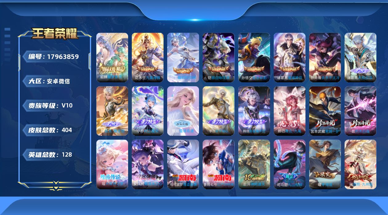 [17963859]安卓WX-V10-至尊星耀I段位-128英雄-404皮肤-6典藏皮肤-1珍品无双-7无双-6珍品传说-56传说-98史诗