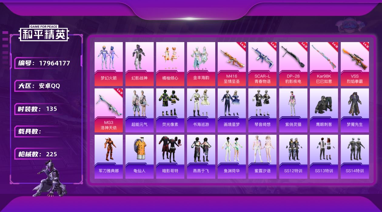 [17964177]安卓 手Q-4粉装-9特效枪-0载具-2粉色飞行器-66859热力值-8王牌印记-135套装-225枪皮