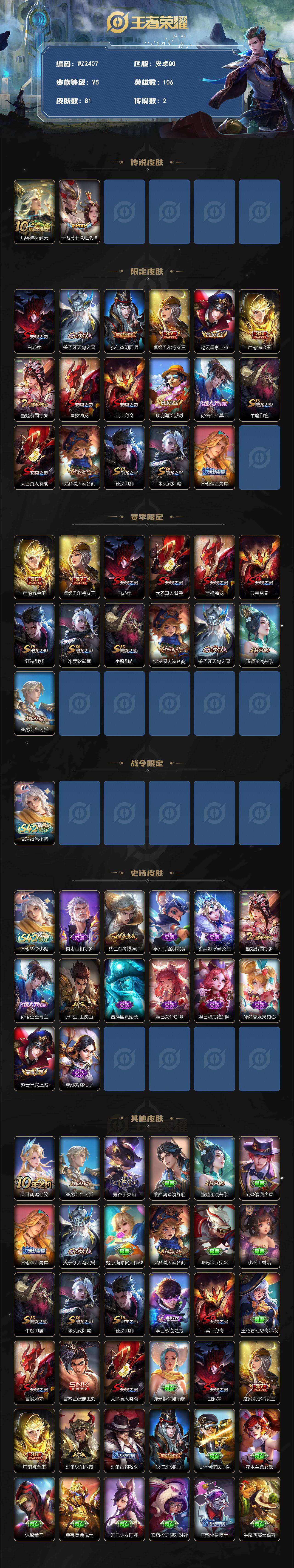 - [12059842]V8 1典藏 18传说 123英雄 286皮肤 可修改实名 女号 优质装备:神鉴启示录,黄金射手座,云鹰飞将(小将军),黄金白羊座,炽阳神光,一念神魔,末日机甲-孙尚香(绿蚂蚱),地狱之眼,游龙清影(小青龙),淬星耀世,超时空战士-狄仁杰,挚爱之约,无双飞将,神器·狴犴令 珍宝阁皮:妄想食味,蔷薇恋人 限定皮:凤求凰(白切鸡),异界灵契(白毛香),傲雪梅枪,时雨天司(水龙头),遇见飞天,高山流水,五谷丰年,梁祝,天狼溯光者,天狼征服者,李小龙,霸王别姬-虞姬,默契交锋-花木兰,孙行者,一生所爱,大圣娶亲,寅虎·赤拳(老虎年限),神器·万象笔,山海·玄木吟(马可年限) 史诗皮:破空之剑,战舞者,蒙犽顽岩魄,埋骨钱,紫霞仙子,苍穹之光,黄金分割率,特工魅影,千年之狐,永昼,江河有灵,魅语,无限星赏官,冰冠公主,偶像歌手,晚萤,电玩·爆裂旋风,暗夜猫娘,龙骑士(小龙虾),末日机甲-吕布,猫狗日记-孙策,猫狗日记-大乔,乱世虎臣,节奏热浪,修罗,女仆咖啡,摇滚巨星,水果甜心,绅士熊喵,星夜王子,心灵骇客,功夫厨神,德古拉伯爵,暗隐猎兽者,鬼剑武藏,心灵战警,舞动绿茵,地狱岩魂,诗语江南,纤云弄巧,繁星吟游(呼啦呼啦),拒霜思,缤纷独角兽,乘风破浪,逐浪之夏,水晶猎龙者,曙光守护者,唤灵魅影,原初追逐者,圣诞狂欢,圣诞恋歌,鹰眼统帅,魅力维加斯,黎明之约,赏金猎手,奇遇舞章,天秀·音浪,无心,未来纪元-赵云