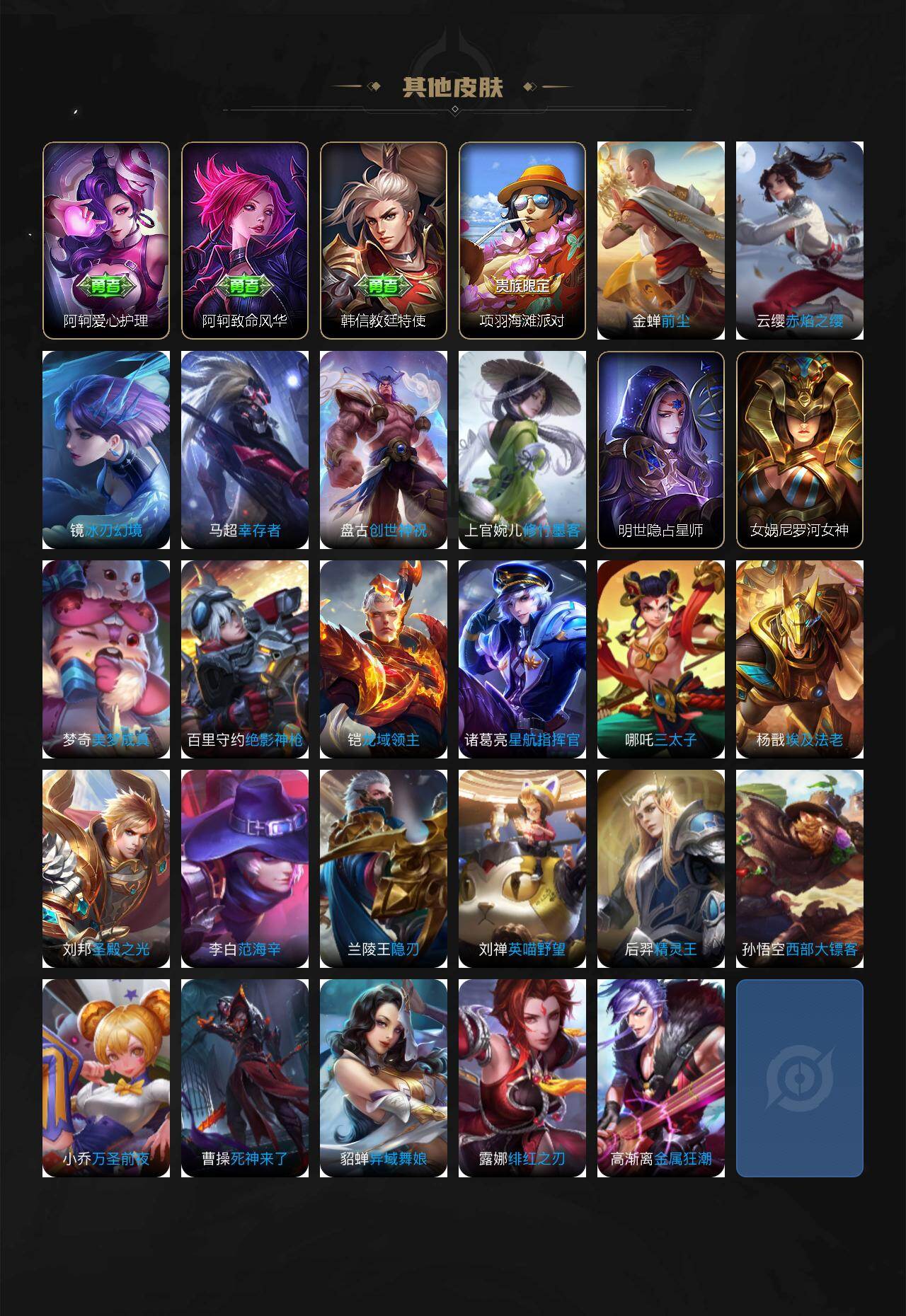 【其他皮肤】:艾琳鹤鸣心笺,亚瑟荣光之誓,鬼谷子克喵,莱西奥踏浪烽翎,甄姬逆浪荇歌,刘备浪漫序章,周瑜熔金海岸,姜子牙天穹之誓,姬小满零食大作战,沈梦溪大漠名商,哪吒次元突破,小乔丁香结,牛魔御旌,米莱狄御霄,狂铁御狮,李白敏锐之力,典韦穷奇,王昭君幻想奇妙夜,曹操烛龙,宫本武藏霸王丸,太乙真人饕餮,钟无艳海滩丽影,白起狰,虞姬凯尔特女王,扁鹊炼金王,刘备汉昭烈帝,刘备纽约教父,狄仁杰阴阳师,后羿阿尔法小队,花木兰兔女郎,达摩拳王,典韦黄金武士,妲己少女阿狸,安琪拉玩偶对对碰,扁鹊化身博士,牛魔西部大镖客,阿轲爱心护理,阿轲致命风华,韩信教廷特使,项羽海滩派对,金蝉前尘,云缨赤焰之缨,镜冰刃幻境,马超幸存者,盘古创世神祝,上官婉儿修竹墨客,明世隐占星师,女娲尼罗河女神,梦奇美梦成真,百里守约绝影神枪,铠龙域领主,诸葛亮星航指挥官,哪吒三太子,杨戬埃及法老,刘邦圣殿之光,李白范海辛,兰陵王隐刃,刘禅英喵野望,后羿精灵王,孙悟空西部大镖客,小乔万圣前夜,曹操死神来了,貂蝉异域舞娘,露娜绯红之刃,高渐离金属狂潮