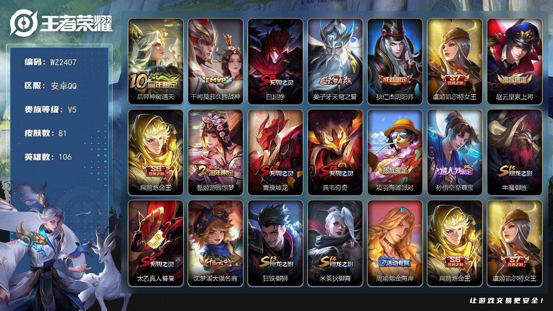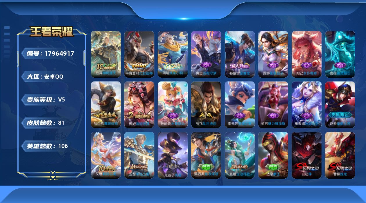 [17964917]安卓Q-81皮肤-2传说-13史诗 【传说皮肤】:后羿神树通天,干将莫邪久胜战神 【限定皮肤】:白起狰,姜子牙天穹之誓,狄仁杰阴阳师,虞姬凯尔特女王,赵云皇家上将,扁鹊炼金王,甄姬游园惊梦,曹操烛龙,典韦穷奇,项羽海滩派对,孙悟空至尊宝,牛魔御旌,太乙真人饕餮,沈梦溪大漠名商,狂铁御狮,米莱狄御霄,周瑜熔金海岸 【赛季限定】:扁鹊炼金王,虞姬凯尔特女王,白起狰,太乙真人饕餮,曹操烛龙,典韦穷奇,狂铁御狮,米莱狄御霄,牛魔御旌,沈梦溪大漠名商,姜子牙天穹之誓,甄姬逆浪荇歌,亚瑟荣光之誓 【战令限定】:周瑜线条小狗 【史诗皮肤】:周瑜线条小狗,黄忠百相守梦,狄仁杰鹰眼统帅,李元芳逐浪之夏,雅典娜冰冠公主,甄姬游园惊梦,孙悟空至尊宝,张飞乱世虎臣,曹操幽灵船长,妲己女仆咖啡,妲己魅力维加斯,孙尚香水果甜心,赵云皇家上将,露娜紫霞仙子 【其他皮肤】:艾琳鹤鸣心笺,亚瑟荣光之誓,鬼谷子克喵,莱西奥踏浪烽翎,甄姬逆浪荇歌,刘备浪漫序章,周瑜熔金海岸,姜子牙天穹之誓,姬小满零食大作战,沈梦溪大漠名商,哪吒次元突破,小乔丁香结,牛魔御旌,米莱狄御霄,狂铁御狮,李白敏锐之力,典韦穷奇,王昭君幻想奇妙夜,曹操烛龙,宫本武藏霸王丸,太乙真人饕餮,钟无艳海滩丽影,白起狰,虞姬凯尔特女王,扁鹊炼金王,刘备汉昭烈帝,刘备纽约教父,狄仁杰阴阳师,后羿阿尔法小队,花木兰兔女郎,达摩拳王,典韦黄金武士,妲己少女阿狸,安琪拉玩偶对对碰,扁鹊化身博士,牛魔西部大镖客,阿轲爱心护理,阿轲致命风华,韩信教廷特使,项羽海滩派对,金蝉前尘,云缨赤焰之缨,镜冰刃幻境,马超幸存者,盘古创世神祝,上官婉儿修竹墨客,明世隐占星师,女娲尼罗河女神,梦奇美梦成真,百里守约绝影神枪,铠龙域领主,诸葛亮星航指挥官,哪吒三太子,杨戬埃及法老,刘邦圣殿之光,李白范海辛,兰陵王隐刃,刘禅英喵野望,后羿精灵王,孙悟空西部大镖客,小乔万圣前夜,曹操死神来了,貂蝉异域舞娘,露娜绯红之刃,高渐离金属狂潮 【营地ID】:1766412559