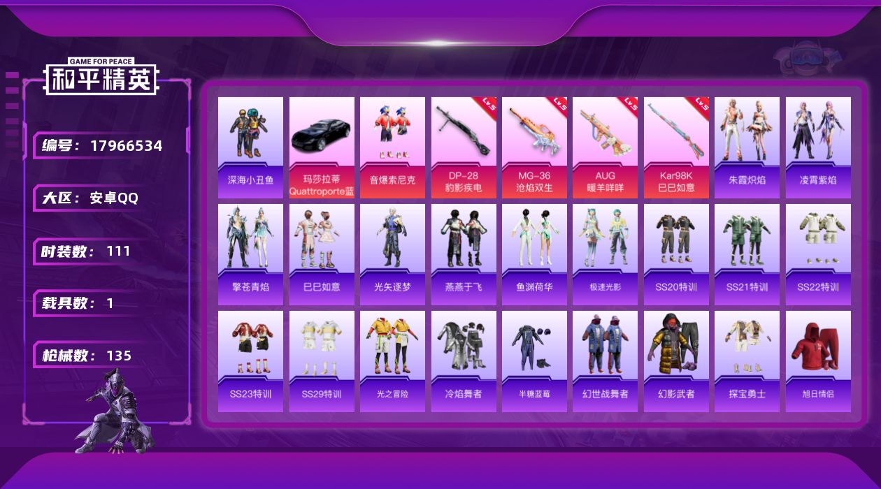 [17966534]安卓 手Q-1粉装-5特效枪-1载具-3粉色飞行器-37724热力值-12王牌印记-111套装-135枪皮 【热门品类】:粉装-音爆索尼克,套装-深海小丑鱼 【粉色套装】:粉装-音爆索尼克 【粉色枪皮等级】:AUG-暖羊咩咩(五级),Kar98K-巳巳如意(五级),Mk14-福马献瑞(五级),DP-28-豹影疾电(五级),MG-36-沧焰双生(五级) 【粉色载具】:玛莎拉蒂Quattroporte(夜幕蓝) 【粉色枪皮】:AUG-暖羊咩咩,Kar98K-巳巳如意,Mk14-福马献瑞,DP-28-豹影疾电,MG-36-沧焰双生 【粉色飞行器】:炫彩糖果飞行器,太空嘟嘟飞行器 【粉色降落伞】:金丰海韵降落伞,智耀战神降落伞,无垠阁降落伞,炫彩糖果降落伞 【稀有套装】:套装-巳巳如意,套装-雪国风尚,套装-炫彩糖果,套装-马上有钱,角色-光矢逐梦,套装-燕燕于飞,套装-鱼渊荷华,套装-极速光影,套装-朱霞炽焰,套装-凌霄紫焰,套装-擎苍青焰 【稀有枪皮】:AUG-冰晶雪宝,AKM-破晓战魂,AKM-龙的传人,M16A4-幻世战舞者,SCAR-L-夜灯,SCAR-L-炫彩节奏,SCAR-L-玉兔迎春,SCAR-L-红色方程式,M416-糯团青竹,M416-红色方程式,M416-蓝色火焰,M416-黄金龙骨,M416-萌萌史莱姆,GROZA-影袭,GROZA-田园牧歌,AUG-天降萌叽,AUG-幻影战神,AUG-耀粉歌者,M762-天降萌叽,M762-奇异狩猎者,Mk47-妙红点点,AC-VAL-天降萌叽,蜜獾-娇憨猪猪,ARX-凌霄紫焰,UZI-娇憨猪猪,UMP45-生命誓言,UMP45-粉色回忆,UMP45-蓝色火焰,Vector-田园牧歌,汤姆逊-像素花束,JS9-凌霄紫焰,P90-翩跹演武,P90-巳巳如意,Kar98K-幻影战神,M24-影袭,AWM-垂柳戏鸭,AWM-黄金龙骨,SKS-炫彩节奏,VSS-田园牧歌,SLR-娇憨猪猪,SLR-彩虹符号,AMR-妙红点点,S686-生命誓言,S686-巳巳如意,S1897-暗夜鎏金,S1897-炫彩节奏,S12K-玩趣呆呆,S12K-娇憨猪猪,S12K-幻世战舞者,DBS-彩虹甜喵,DBS-彩虹符号,DBS-月影灵韵,SPAS-12-田园牧歌,M249-妙红点点,M249-糯团青竹,DP-28-彩虹符号,MG3-妙红点
