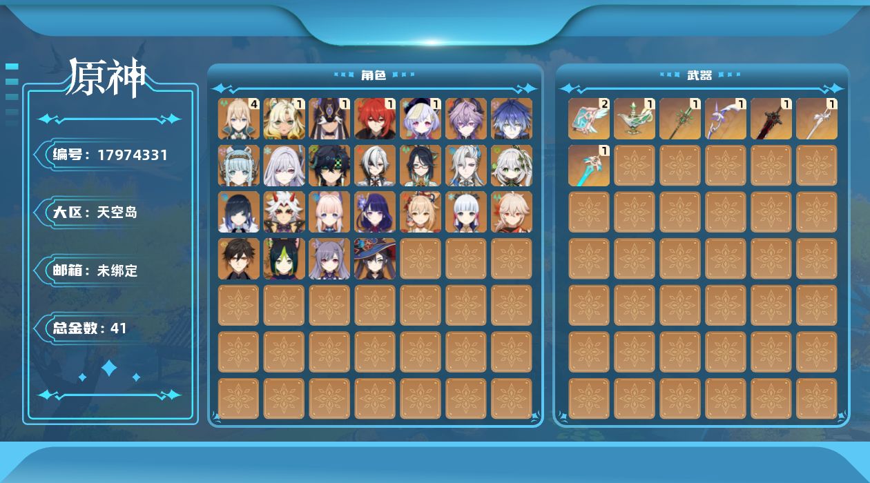 0命阿蕾奇诺,0命闲云,0命那维莱特,0命纳西妲,1命赛诺,0命提纳里,0命夜兰,0命荒泷一斗,0命雷电将军,0命枫原万叶,0命神里绫华,0命钟离,0命宵宫,0命珊瑚宫心海,0命刻晴,1命七七,4命琴,0命莫娜,1命迪卢克,0命基尼奇,1命希诺宁,0命丝柯克,0命伊涅芙,0命菲林斯,0命杜林,精1千夜浮梦,精1和璞鸢,精1阿莫斯之弓,精1天空之刃,精2天空之卷,精1风鹰剑,精1狼的末路