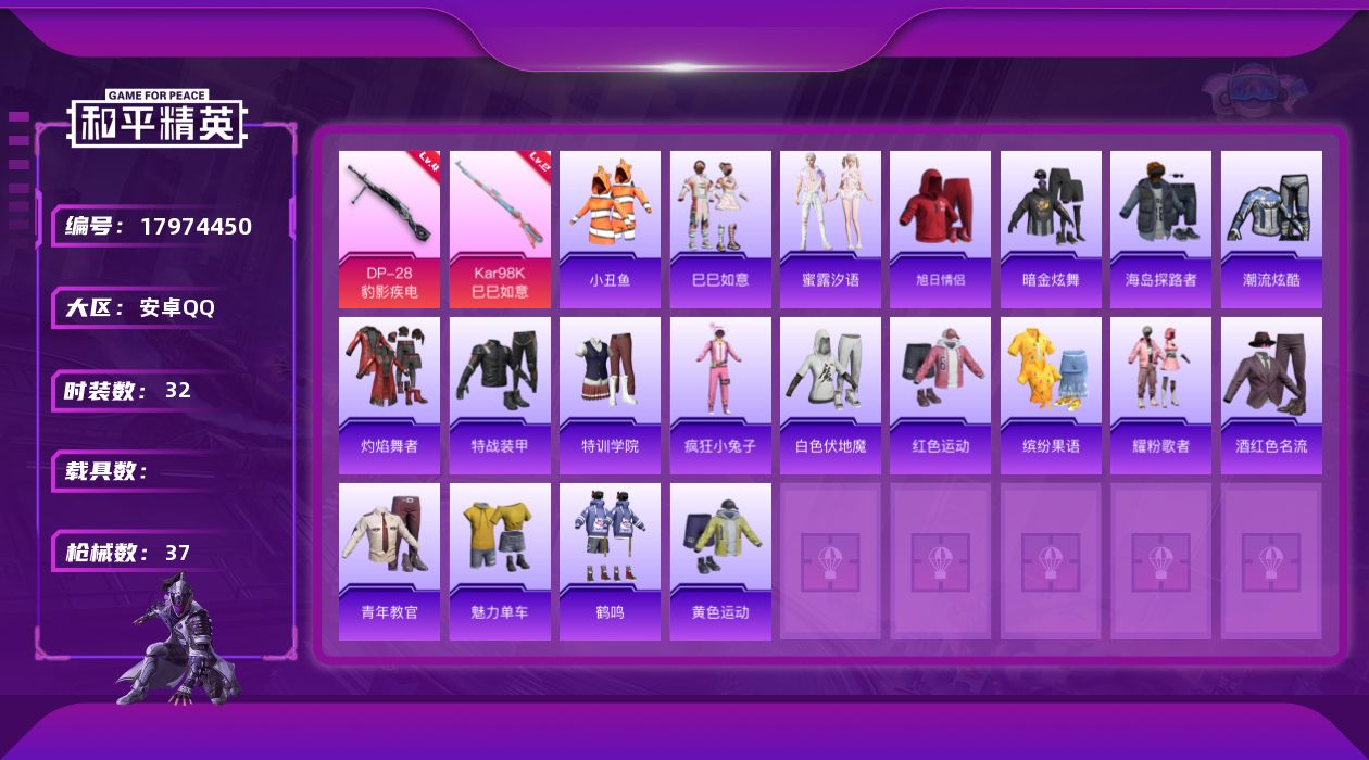 [17974450]安卓 手Q-0粉装-2特效枪-0载具-1粉色飞行器-8869热力值-0王牌印记-32套装-37枪皮 【热门品类】:套装-小丑鱼 【粉色枪皮等级】:Kar98K-巳巳如意(二级),DP-28-豹影疾电(四级) 【粉色枪皮】:Kar98K-巳巳如意,DP-28-豹影疾电 【粉色飞行器】:炫彩糖果飞行器 【粉色降落伞】:炫彩糖果降落伞 【稀有套装】:套装-巳巳如意,套装-蜜露汐语 【稀有枪皮】:SCAR-L-炫彩节奏,M416-蓝色火焰,M762-彩虹符号,G36C-星穹咏叹调,AC-VAL-天降萌叽,UZI-天降萌叽,UMP45-极意拳锋,汤姆逊-天降萌叽,SKS-炫彩节奏,DP-28-彩虹符号,MG3-幻世战舞者,R45-幻彩电音 【其他套装】:套装-旭日情侣,套装-暗金炫舞,套装-海岛探路者,套装-潮流炫酷,套装-灼焰舞者,套装-特战装甲,套装-特训学院,套装-疯狂小兔子,套装-白色伏地魔,套装-红色运动,套装-缤纷果语,套装-耀粉歌者,套装-酒红色名流,套装-青年教官,套装-魅力单车,套装-鹤鸣,套装-黄色运动 【营地ID】:1016416592