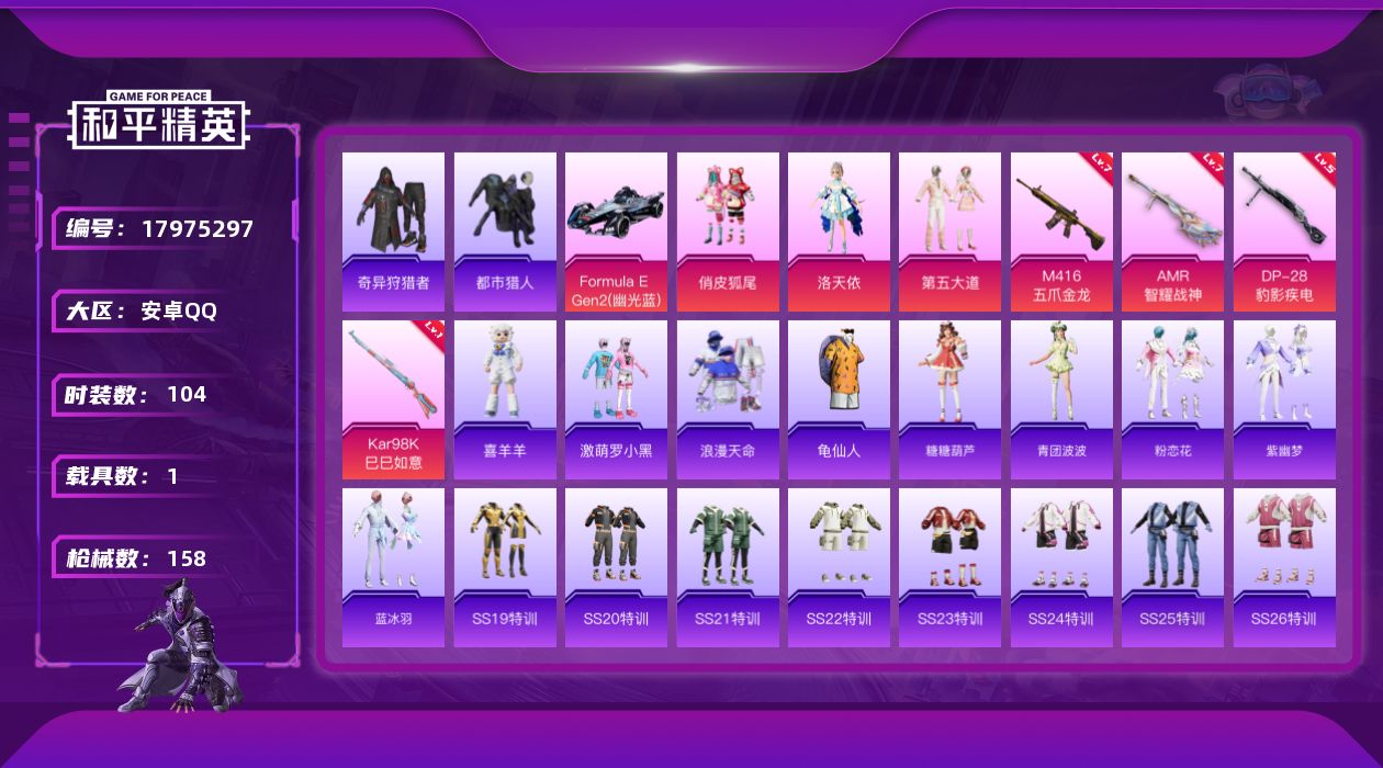 [17975297]安卓 手Q-3粉装-4特效枪-1载具-1粉色飞行器-45401热力值-2王牌印记-104套装-158枪皮
