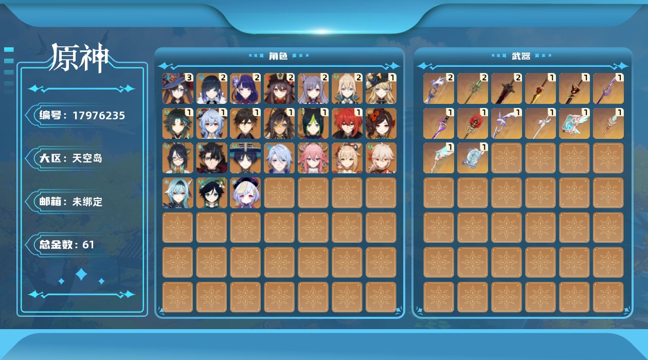 0命千织,0命闲云,1命娜维娅,0命莱欧斯利,1命迪希雅,0命流浪者,1命提纳里,2命夜兰,0命神里绫人,0命八重神子,0命优菈,2命雷电将军,0命枫原万叶,1命钟离,2命胡桃,1命甘雨,1命魈,0命宵宫,0命温迪,2命刻晴,0命七七,2命琴,3命莫娜,1命迪卢克,精1有乐御簾切,精2若水,精1赤角石溃杵,精1薙草之稻光,精1雾切之回光,精1护摩之杖,精1四风原典,精2和璞鸢,精1天空之脊,精1天空之翼,精1阿莫斯之弓,精1天空之卷,精1风鹰剑,精2狼的末路