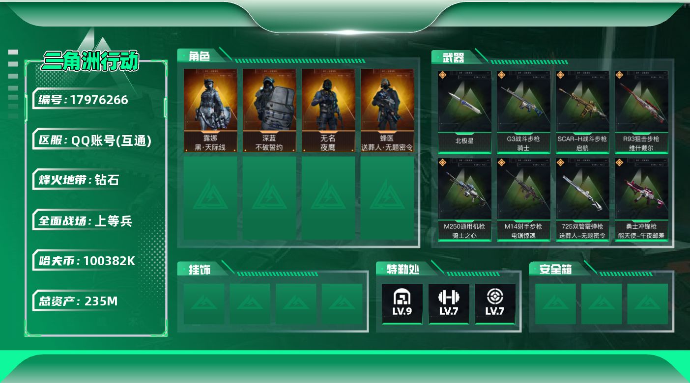[17976266]235m总资产-100382k哈夫币-60烽火等级-钻石-18战场等级-上等兵