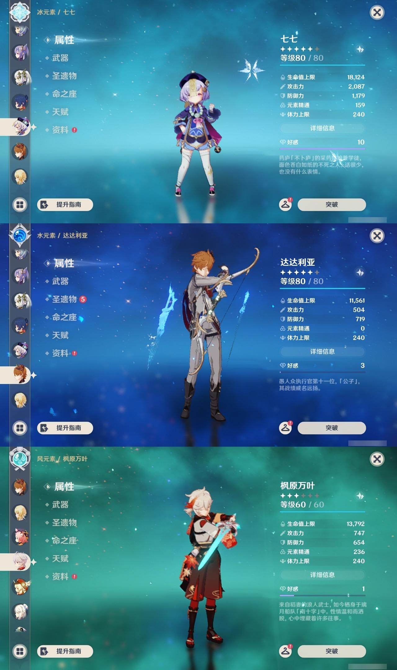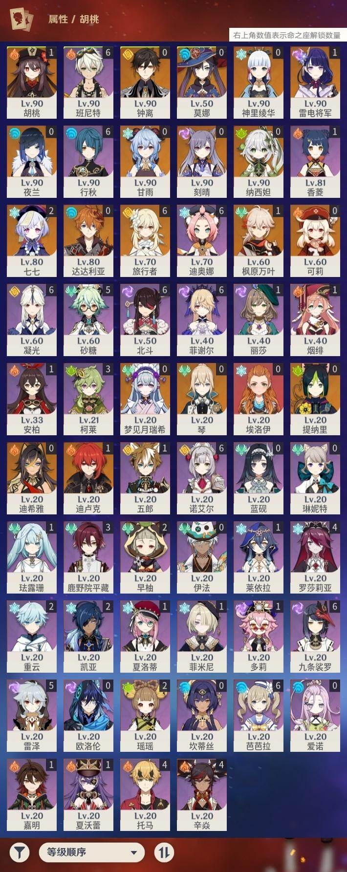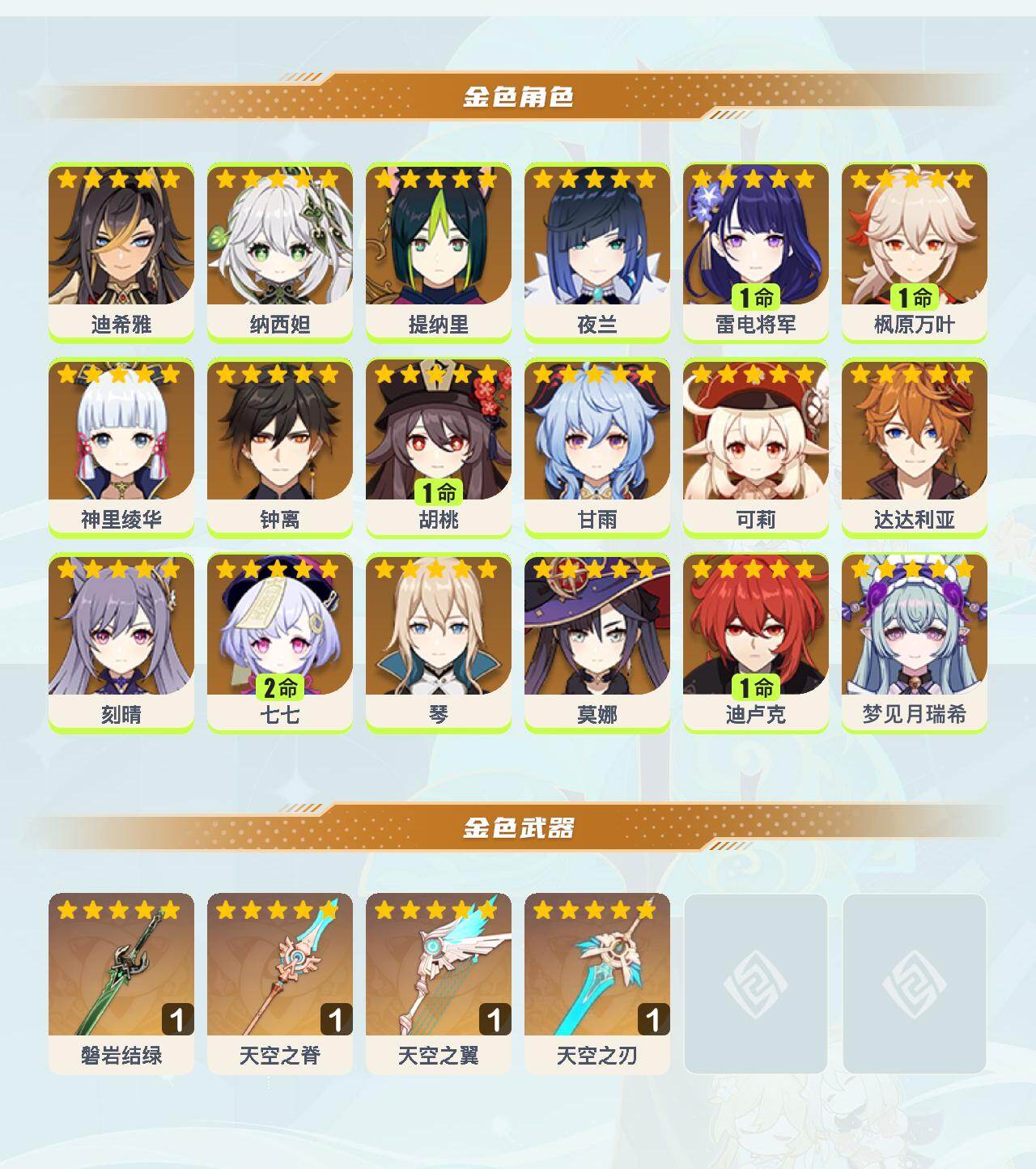 0命迪希雅,0命纳西妲,0命提纳里,0命夜兰,1命雷电将军,1命枫原万叶,0命神里绫华,0命钟离,1命胡桃,0命甘雨,0命可莉,0命达达利亚,0命刻晴,2命七七,0命琴,0命莫娜,1命迪卢克,0命梦见月瑞希,精1磐岩结绿,精1天空之脊,精1天空之翼,精1天空之刃