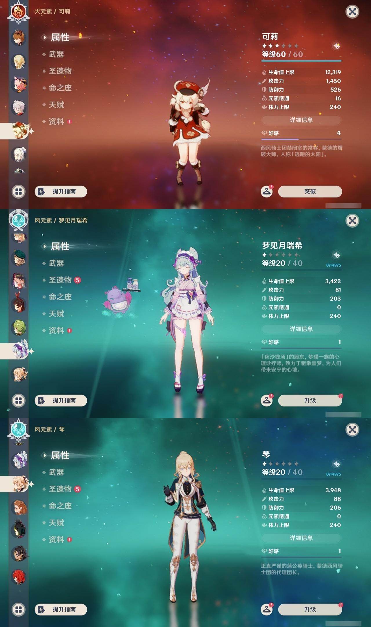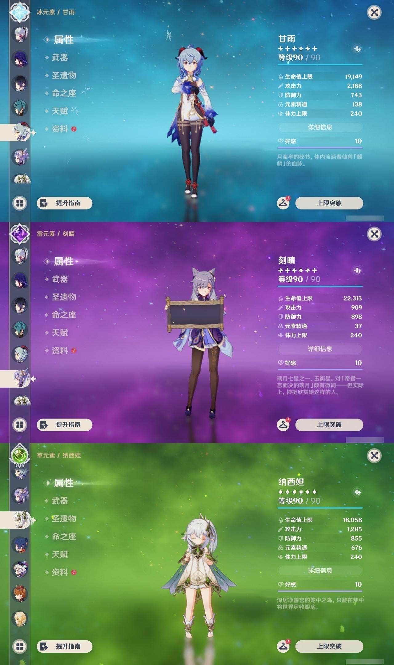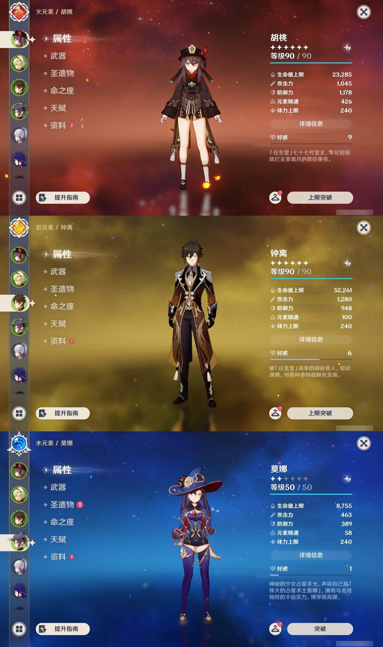 胡桃,钟离,莫娜,神里凌华,雷电将军,甘雨,刻晴,七七,达达利亚,枫原万叶,可莉,琴,迪卢克