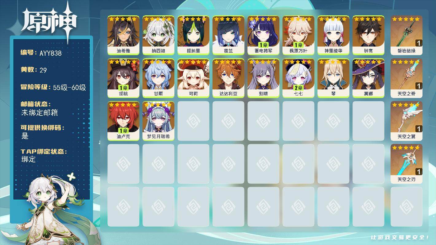 [17976545]57级/29黄/女主/18个五星角色/5个五星武器 0命迪希雅,0命纳西妲,0命提纳里,0命夜兰,1命雷电将军,1命枫原万叶,0命神里绫华,0命钟离,1命胡桃,0命甘雨,0命可莉,0命达达利亚,0命刻晴,2命七七,0命琴,0命莫娜,1命迪卢克,0命梦见月瑞希,精1磐岩结绿,精1天空之脊,精1天空之翼,精1天空之刃