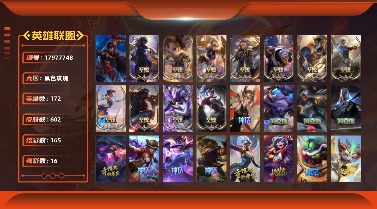 [17977748]未定级段位-172英雄-602皮肤-165炫彩-1终极-23神话-96限定-55传说-124史诗