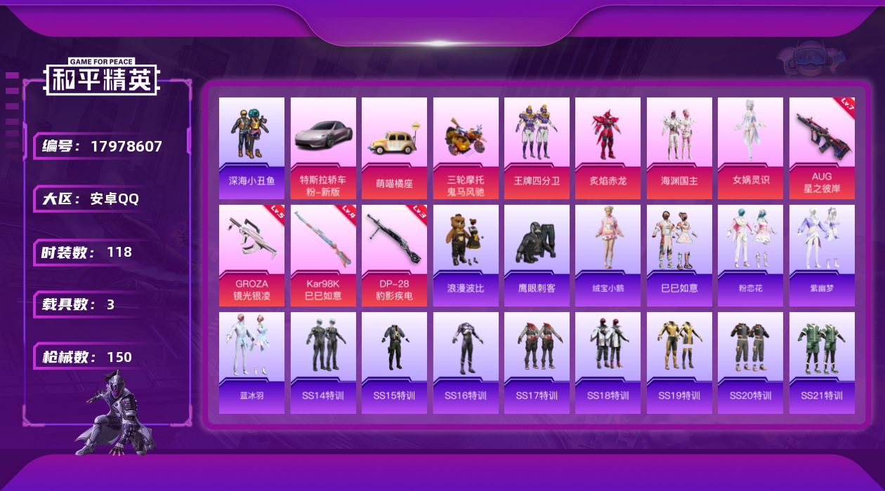 [17978607]安卓 手Q-4粉装-4特效枪-3载具-1粉色飞行器-50225热力值-7王牌印记-118套装-150枪皮【热门品类】:套装-深海小丑鱼,套装-浪漫波比【粉色套装】:粉装-王牌四分卫,粉装-炙焰赤龙,粉装-海渊国主,角色-女娲灵识【粉色枪皮等级】:GROZA-镜光银凌(五级),AUG-星之彼岸(七级),Kar98K-巳巳如意(四级),DP-28-豹影疾电(三级)【粉色载具】:特斯拉Roadster(沁心粉),萌喵橘座,鬼马风驰【粉色枪皮】:GROZA-镜光银凌,AUG-星之彼岸,Kar98K-巳巳如意,DP-28-豹影疾电【粉色飞行器】:夏日绵绵冰飞行器
