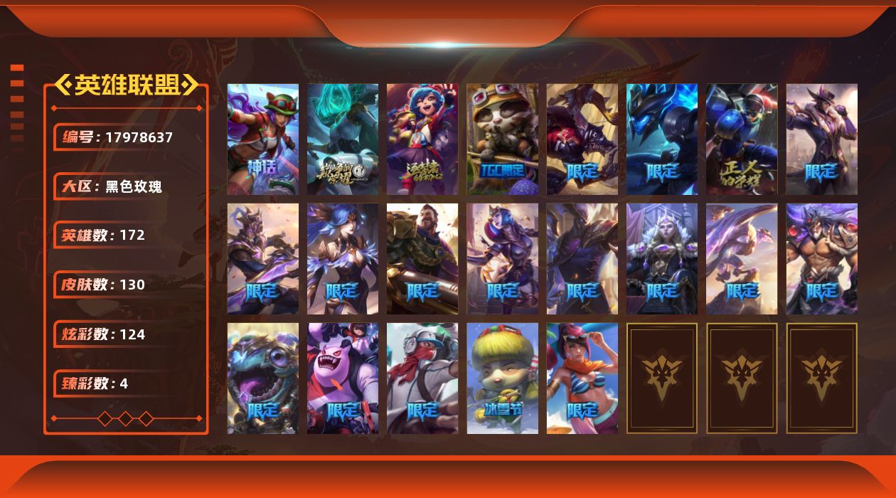 [17978637]未定级段位-172英雄-130皮肤-124炫彩-0终极-3神话-20限定-7传说-28史诗
