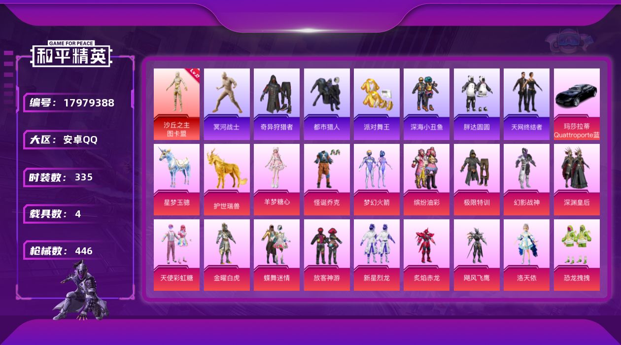 [17979388]安卓 手Q-2神装-33粉装-25特效枪-4载具-28粉色飞行器-166663热力值-21王牌印记-335套装-446枪皮 【红色神装等级】:灵驹仙姬-云歌(一级),沙丘之主-图卡盟(二级) 【红色角色神装】:灵驹仙姬-云歌,沙丘之主-图卡盟 【热门品类】:粉装-怪诞乔克,粉装-梦幻火箭,粉装-缤纷油彩,套装-浪漫天命,套装-都市猎人,套装-冥河战士,套装-派对舞王,套装-深海小丑鱼,套装-小丑鱼,套装-奇异狩猎者,角色-军刀雅典娜,套装-胖达圆圆,套装-天网终结者,套装-忍者信条,角色-忠真马岱,角色-忠义严颜,套装-龟仙人,套装-暗影哥特,套装-粉红小猪,角色-8号机,角色-Mark.06,熔岩游骑兵连帽夹克,套装-红熊茄茄 【粉色套装】:粉装-极限特训,粉装-幻影战神,粉装-怪诞乔克,粉装-深渊皇后,粉装-天使彩虹糖,粉装-金曜白虎,粉装-蝶舞迷情,粉装-梦幻火箭,粉装-缤纷油彩,粉装-放客神游,粉装-新星烈龙,粉装-炙焰赤龙,粉装-飓风飞鹰,角色-洛天依,粉装-恐龙拽拽,粉装-紫电风暴,粉装-太空嘟嘟,粉装-千面幻镜,粉装-暗夜鎏金,角色-白勺歌姬,角色-呆萌星弥,粉装-未来歌姬,粉装-莲影清波,角色-冰炎战车,角色-小叽联名款,角色-初号机 觉醒Ver.,角色-萨利娅,粉装-星穹咏叹调,角色-奇迹舞步 美雪,角色-羊梦糖心,角色-烬夜之誓,人物-小舞·恋语 【粉色枪皮等级】:AKM-炫紫旋律(七级),SCAR-L-锦绣绵绵(五级),SCAR-L-金蛇镇世(三级),M416-超新星(三级),M416-电玩时刻(五级),GROZA-镜光银凌(五级),AUG-星梦奇缘(三级),AUG-暖羊咩咩(五级),M762-青锋波束(五级),ACE32-萌骑漫游(三级),UMP45-量子极限(五级),Vector-环太平洋(六级),汤姆逊-热量炸弹(五级),AKS-74U-森灵之息(五级),Kar98K-巳巳如意(五级),Kar98K-圣域龙灵(三级),M24-镜域双华(三级),Mk14-甜梦熊击(五级),Mk14-福马献瑞(五级),AMR-智耀战神(七级),M200-梦海之灵(二级),DP-28-豹影疾电(五级),MG-36-沧焰双生(五级),燃烧瓶-薄荷可可(七级),破片手榴弹-瓶中星球(七级) 【粉色载具】:玛莎拉蒂Quattroporte(夜幕蓝),星梦玉骢,护世