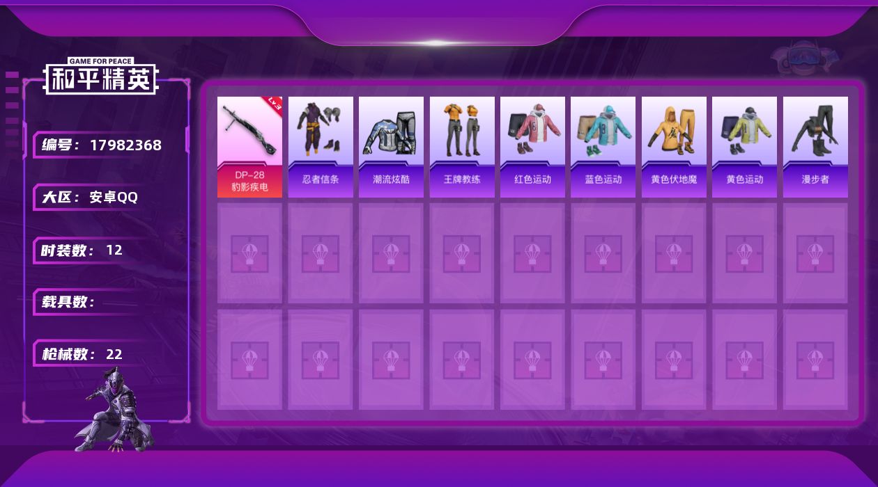 [17982368]安卓 手Q-0粉装-3特效枪-0载具-0粉色飞行器-4007热力值-0王牌印记-12套装-22枪皮 【热门品类】:套装-忍者信条 【粉色枪皮等级】:UMP45-萌骑冒险(三级),Mk14-福马献瑞(三级),DP-28-豹影疾电(三级) 【粉色枪皮】:UMP45-萌骑冒险,Mk14-福马献瑞,DP-28-豹影疾电 【粉色降落伞】:喜羊羊与灰太狼降落伞 【稀有套装】:套装-马上有钱 【稀有枪皮】:AUG-幻影战神,AUG-耀粉歌者,蜜獾-虎痴许褚,Kar98K-星穹咏叹调,SKS-炫彩节奏,S12K-幻影战神,MG3-幻世战舞者,爆炸猎弓-喜羊羊与灰太狼 【其他套装】:套装-潮流炫酷,套装-王牌教练,套装-红色运动,套装-蓝色运动,套装-黄色伏地魔,套装-黄色运动,套装-漫步者 【稀有背包】:幻影战神背包(1级) 【营地ID】:1042113292