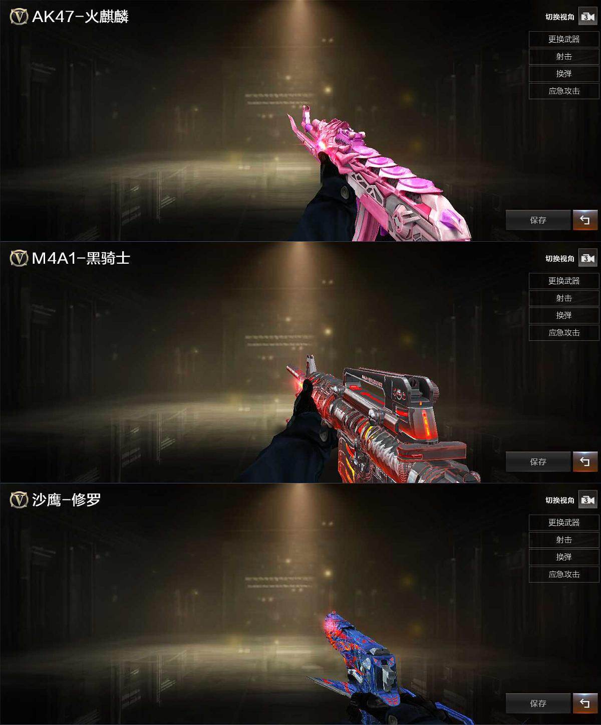 【英雄级武器】:AK47-火麒麟,M4A1-黑骑士,AN94-超新星,HK417-朱雀,黑武士-锦绣游龙,M4A1-玫瑰精灵,沙鹰-修罗,擎天,麒麟刺