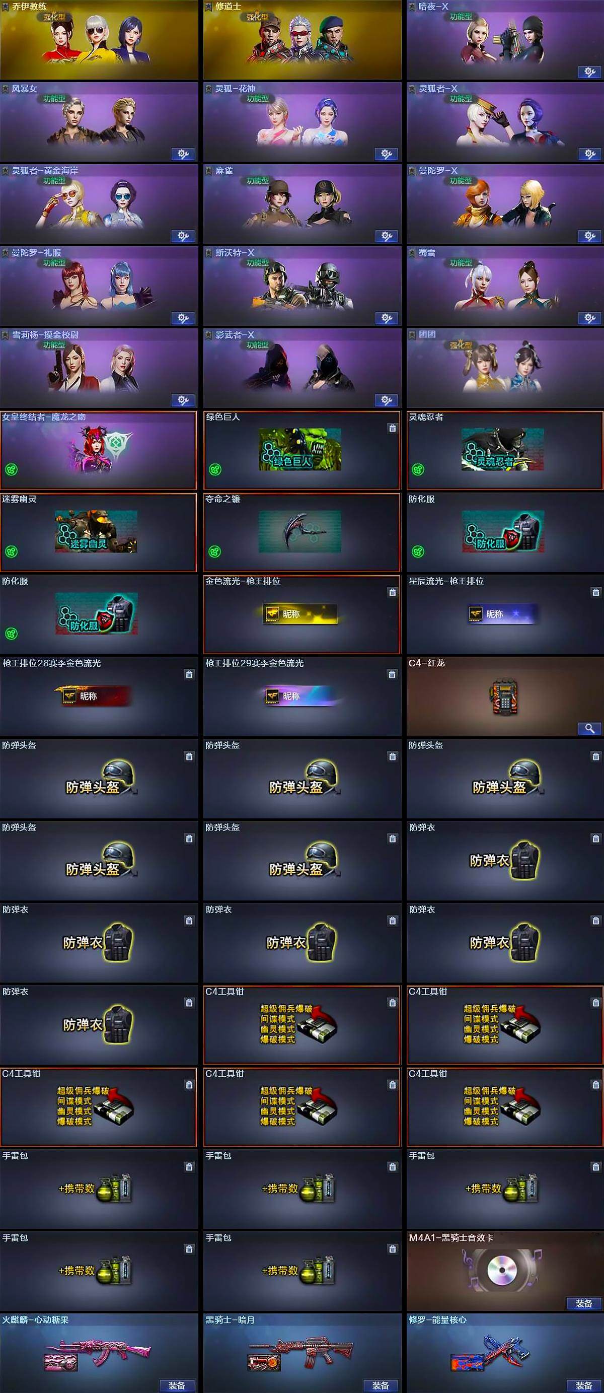 【道具】:女皇终结者-魔龙之吻,绿色巨人,灵魂忍者,迷雾幽灵,夺命之镰,防化服*2,金色流光-枪王排位,星辰流光-枪王排位,枪王排位28赛季金色流光,枪王排位29赛季金色流光,C4-红龙,防弹头盔*5,防弹衣*5,C4工具钳*5,手雷包*5