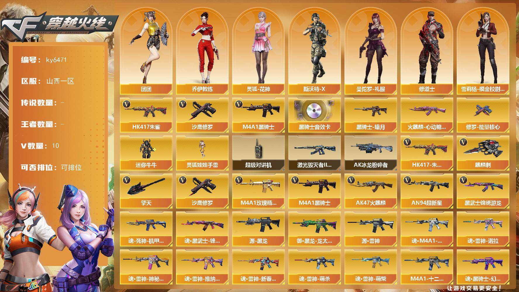 [17984961]【ky6471】山西一区-10V-0王者武器数-0炫金武器数 【热门武器】:HK417-朱雀,M4A1-黑骑士,沙鹰-修罗 【音效卡】:M4A1-黑骑士音效卡 【皮肤】:火麒麟-心动糖果,黑骑士-暗月,修罗-能量核心 【角色】:乔伊教练,修道士,暗夜-X,风暴女,灵狐-花神,灵狐者-X,灵狐者-黄金海岸,麻雀,曼陀罗-X,曼陀罗-礼服,斯沃特-X,蜀雪,雪莉杨-摸金校尉,影武者-X,团团 【人偶武器】:迷你牛牛,灵狐娃娃手雷 【暴走生化】:超级对讲机 【挑战大师】:AK47-冰龙粉碎者,激光毁灭者III-白马银枪*2 【英雄级武器】:AK47-火麒麟,M4A1-黑骑士,AN94-超新星,HK417-朱雀,黑武士-锦绣游龙,M4A1-玫瑰精灵,沙鹰-修罗,擎天,麒麟刺 【源级武器】:源-黑龙,御·黑龙-龙太子,源·雷神*2,魂·M4A1-雷神-化蛇,魂·雷神-诺拉,魂·雷神-神秘按键,魂·雷神-维纳斯,魂·雷神-新春神龙,魂-雷神-萌杀,魂·雷神-萌柴,M4A1-十二生肖·龙-雷神,魂·黑骑士-幻能朋克*2,魂·黑骑士-破浪10年*2,御·黑骑士-冰魄,御·黑骑士·哪吒闹海,魂-死神-机甲核心,魂·黑武士-锋芒破茧,源·武圣,魂·HK417-朱雀-凤灵,灵·HK417-朱雀-甜蜜火力,源-金色蔷薇,魂·QBZ03-金色蔷薇-萌杀,源·天龙,魂·天龙-彼岸花,魂·裁决-凤灵*2,魂·裁决-新人王绿豆,魂·裁决-羽掣,源·毁灭*2,魂·毁灭-秦师*2,御·毁灭-黑大圣,源·Barrett-朱雀,魂·炼狱-蒸汽钟表,加特林-炼狱-掌火,魂·修罗-神兵利器,魂·天神-阿努比斯,魂·屠龙-春桃,魂·屠龙-惊鸿,源·擎天-萌杀,魂·龙啸-秦师,魂·麒麟刺-神秘黑洞 【道具】:女皇终结者-魔龙之吻,绿色巨人,灵魂忍者,迷雾幽灵,夺命之镰,防化服*2,金色流光-枪王排位,星辰流光-枪王排位,枪王排位28赛季金色流光,枪王排位29赛季金色流光,C4-红龙,防弹头盔*5,防弹衣*5,C4工具钳*5,手雷包*5 【特殊枪械】:1黑骑士