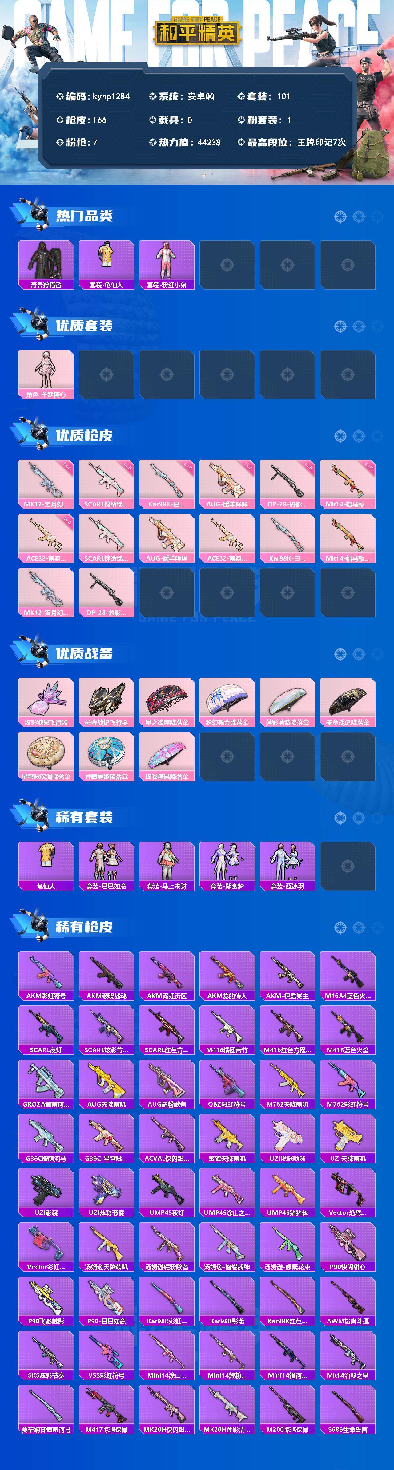 - [17607562]安卓 手Q-3粉装-9特效枪-0载具-2粉色飞行器-42697热力值-2王牌印记-79套装-158枪皮 【热门品类】:套装-浪漫天命,套装-龟仙人 【粉色套装】:角色-洛天依,角色-千金淑猫,粉装-雪月幻音 【粉色枪皮等级】:GROZA-镜光银凌(五级),Kar98K-巳巳如意(一级),Mk14-福马献瑞(五级),AMR-智耀战神(六级),M417-第五大道(六级),AA12-G-萌骑幻想(五级),DP-28-千金淑猫(五级),DP-28-豹影疾电(一级),MG3-洛神天依(七级) 【粉色枪皮】:GROZA-镜光银凌,Kar98K-巳巳如意,Mk14-福马献瑞,AMR-智耀战神,M417-第五大道,AA12-G-萌骑幻想,DP-28-千金淑猫,DP-28-豹影疾电,MG3-洛神天依 【粉色飞行器】:炫彩糖果飞行器,极意拳锋飞行器 【粉色降落伞】:星之彼岸降落伞,精灵梦叶罗丽降落伞,千金淑猫降落伞,月影灵韵降落伞,鬼刀降落伞,樱桃泡泡降落伞,喜羊羊与灰太狼降落伞,炫彩糖果降落伞,辉云木星降落伞 【稀有套装】:套装-龟仙人,套装-雪国风尚,套装-炫彩糖果,套装-马上来财,套装-雏菊兔兔,套装-萝兰蝴蝶,套装-糖糖葫芦,套装-青团波波,套装-棉花软糖,角色-都市丽猫,角色-摩登魅猫,套装-燕燕于飞,套装-鱼渊荷华,套装-粉恋花,套装-紫幽梦,套装-蓝冰羽,套装-霓虹热舞,角色-时希公主,角色-玫纹锢梦,角色-黯羽织刑 【稀有枪皮】:AUG-冰晶雪宝,AKM-灼热熔岩,M16A4-千金淑猫,SCAR-L-炫彩节奏,SCAR-L-绯月迷踪,M416-蓝色火焰,GROZA-懵萌河马,AUG-天降萌叽,AUG-耀粉歌者,QBZ-彩虹符号,QBZ-洛神天依,Mk47-妙红点点,Mk47-洛神天依,G36C-懵萌河马,G36C-星穹咏叹调,AC-VAL-快闪甜心,蜜獾-绯穹魔姬,UZI-啾咪啾咪,UZI-天降萌叽,UZI-月影灵韵,Vector-焰鹰斗篷,Vector-生命誓言,汤姆逊-耀粉歌者,汤姆逊-像素花束,汤姆逊-智耀战神,野牛-最终圣卫者,P90-快闪甜心,Kar98K-洛神天依,Kar98K-炫彩节奏,Kar98K-星穹咏叹调,AWM-焰鹰斗篷,SKS-炫彩节奏,VSS-星之彼岸,Mini14-炫彩节奏,QBU-飒粉甜心,莫辛纳甘-懵萌河马,AMR-妙红点点,AMR-喜