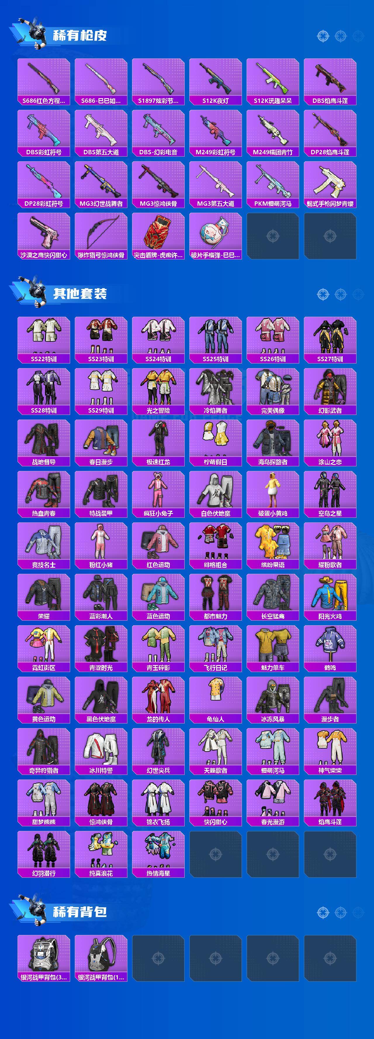 【稀有枪皮】:AKM-彩虹符号,AKM-破晓战魂,AKM-霓虹街区,AKM-龙的传人,AKM-棋盘冕主,M16A4-蓝色火焰,SCAR-L-夜灯,SCAR-L-炫彩节奏,SCAR-L-红色方程式,M416-糯团青竹,M416-红色方程式,M416-蓝色火焰,GROZA-懵萌河马,AUG-天降萌叽,AUG-耀粉歌者,QBZ-彩虹符号,M762-天降萌叽,M762-彩虹符号,G36C-懵萌河马,G36C-星穹咏叹调,AC-VAL-快闪甜心,蜜獾-天降萌叽,UZI-啾咪啾咪,UZI-天降萌叽,UZI-影袭,UZI-炫彩节奏,UMP45-夜灯,UMP45-涂山之恋,UMP45-猪猪侠,Vector-焰鹰斗篷,Vector-彩虹符号,汤姆逊-天降萌叽,汤姆逊-耀粉歌者,汤姆逊-像素花束,汤姆逊-智耀战神,P90-快闪甜心,P90-飞驰魅影,P90-巳巳如意,Kar98K-彩虹符号,Kar98K-影袭,Kar98K-红色方程式,AWM-焰鹰斗篷,SKS-炫彩节奏,VSS-彩虹符号,Mini14-涂山之恋,Mini14-耀粉歌者,Mini14-银河战甲,Mk14-治愈之星,莫辛纳甘-懵萌河马,M417-惊鸿侠骨,MK20-H-快闪甜心,MK20-H-莲影清波,M200-惊鸿侠骨,S686-生命誓言,S686-红色方程式,S68