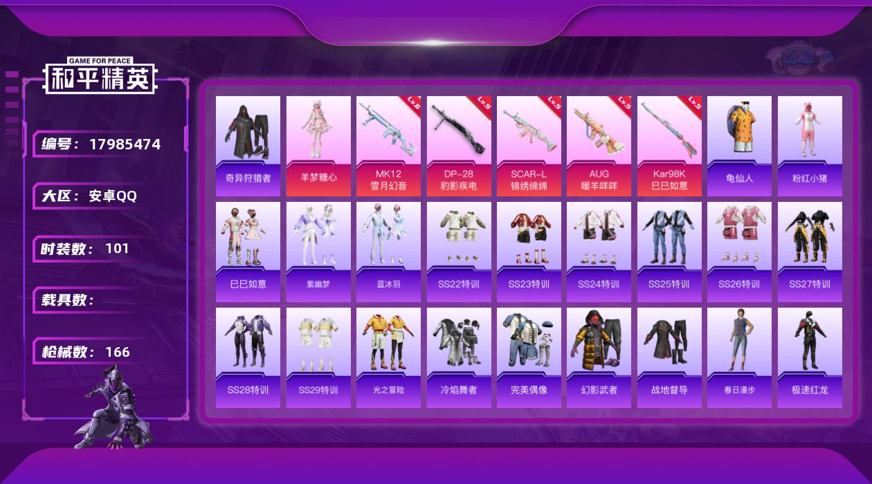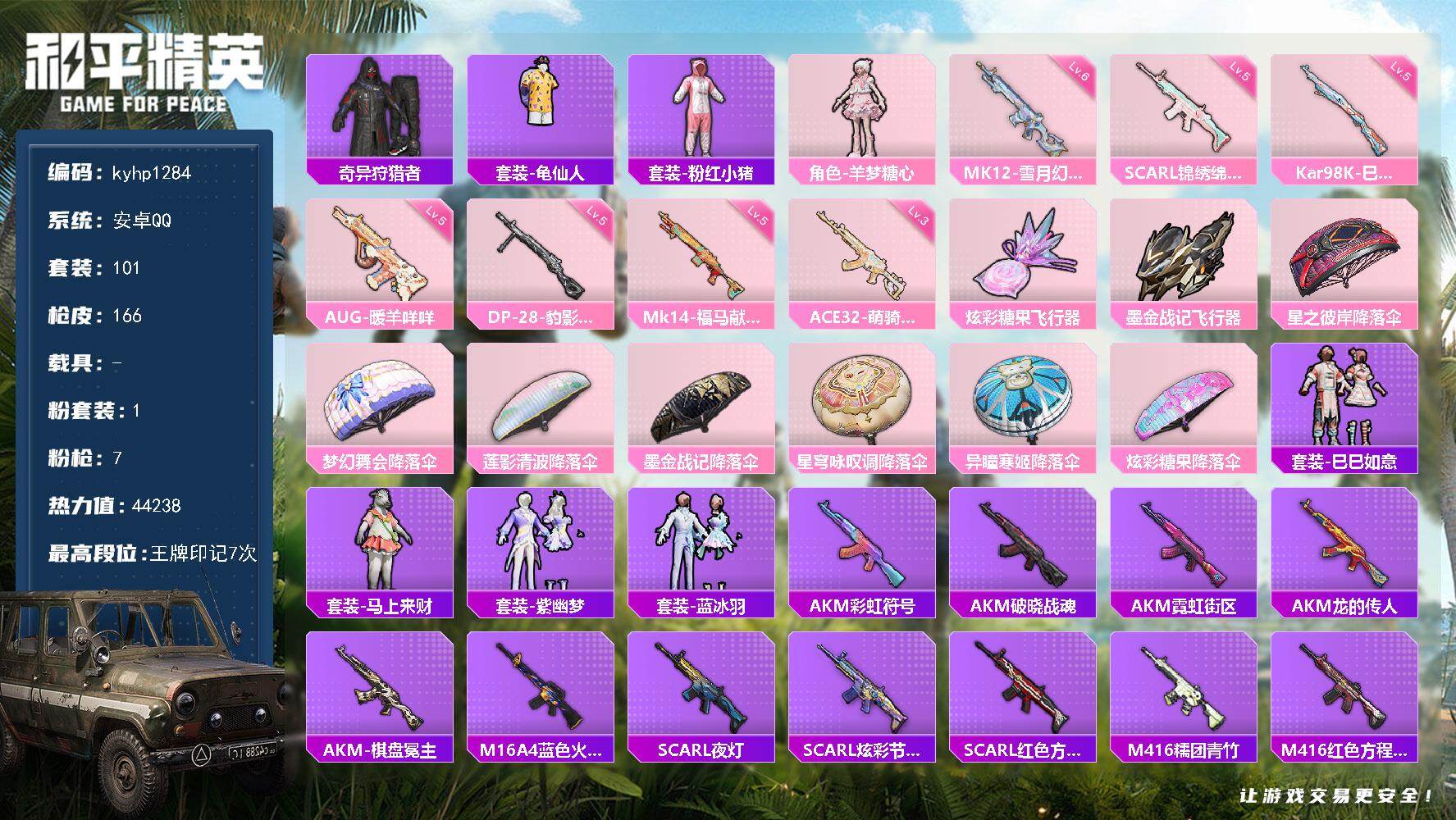 [17985474]安卓 手Q-1粉装-7特效枪-0载具-2粉色飞行器-44238热力值-7王牌印记-101套装-166枪皮