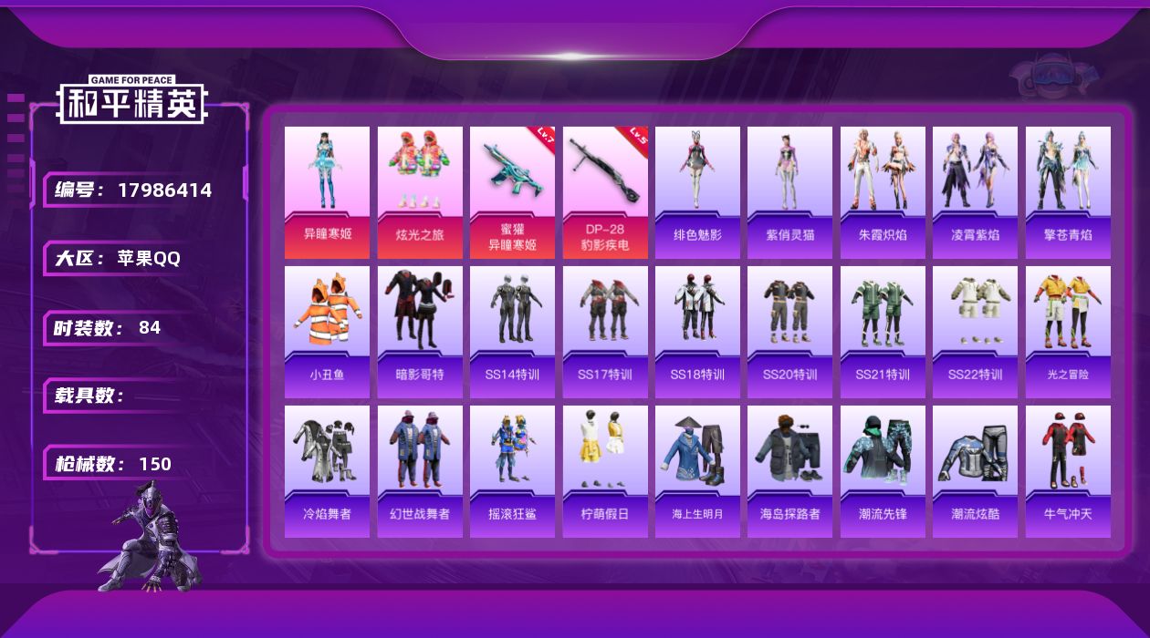 [17986414]【特价出售/店主推荐】苹果 手Q-2粉装-3特效枪-2粉色飞行器-40245热力值-3王牌印记-84套装-150枪皮【热门品类】:套装-小丑鱼,套装-暗影哥特【粉色套装】:粉装-炫光之旅,角色-异瞳寒姬【粉色枪皮等级】:蜜獾-异瞳寒姬(七级),Mk14-福马献瑞(五级),DP-28-豹影疾电(五级)【粉色枪皮】:蜜獾-异瞳寒姬,Mk14-福马献瑞,DP-28-豹影疾电【粉色飞行器】:炫彩糖果飞行器,千面幻镜飞行器