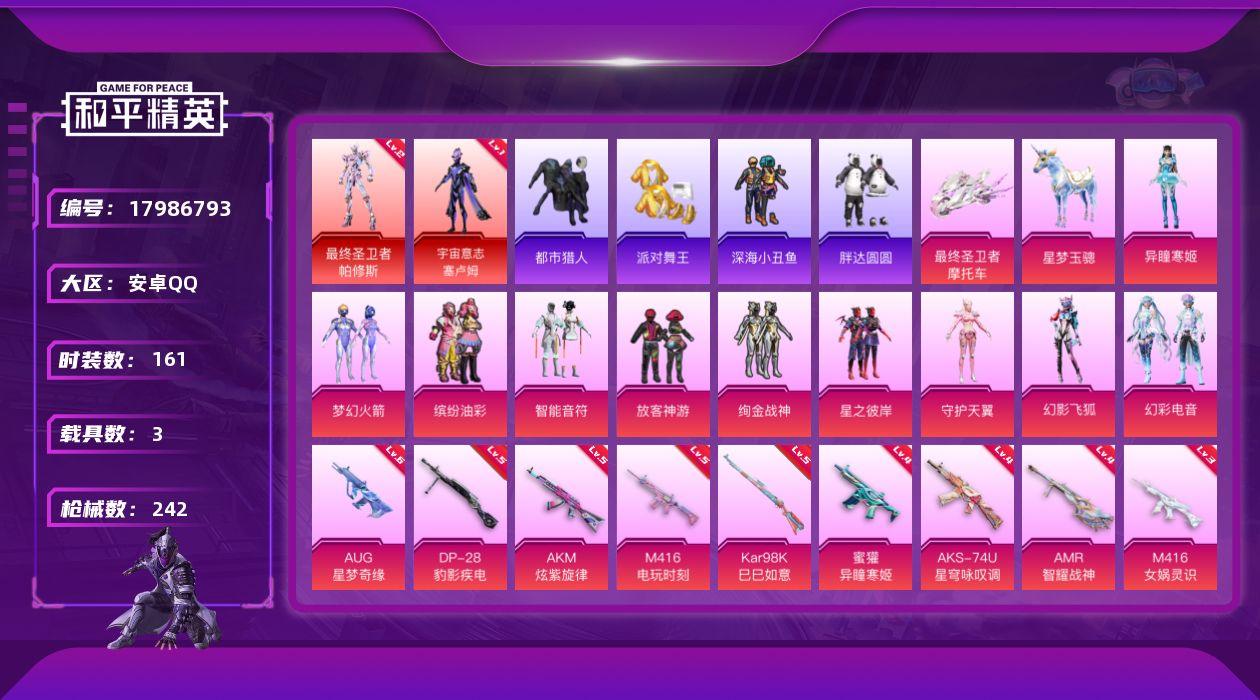 [17986793]安卓 手Q-3神装-11粉装-13特效枪-3载具-9粉色飞行器-87037热力值-8王牌印记-161套装-242枪皮