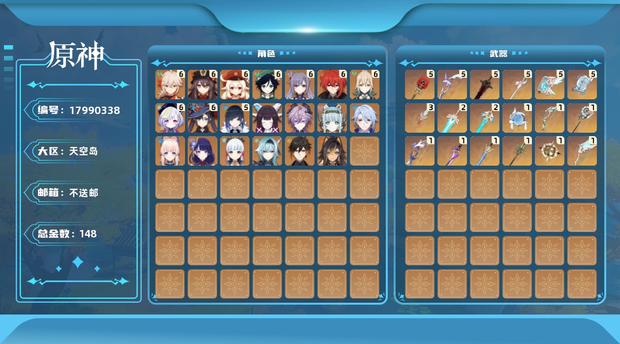 0命迪希雅,5命夜兰,0命神里绫人,0命优菈,0命雷电将军,满命枫原万叶,0命神里绫华,0命钟离,满命胡桃,满命温迪,满命可莉,0命珊瑚宫心海,满命刻晴,满命七七,满命琴,满命莫娜,满命迪卢克,0命伊涅芙,0命杜林,0命哥伦比娅,精1若水,精1雾切之回光,精1苍古自由之誓,精5护摩之杖,精5四风原典,精1和璞鸢,精3天空之脊,精1天空之翼,精5阿莫斯之弓,精2天空之刃,精5天空之卷,精1尘世之锁,精5风鹰剑,精5狼的末路,精2天空之傲,精1支离轮光,精1黎明破晓之史,精1帷间夜曲