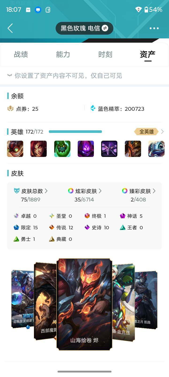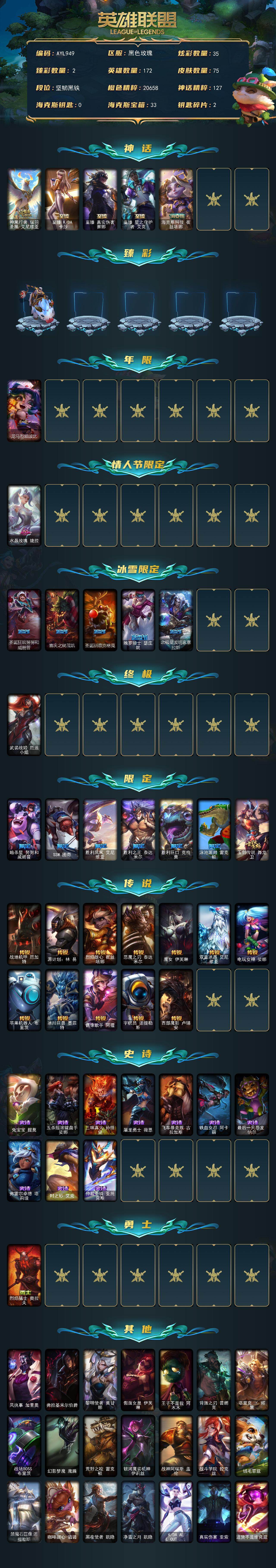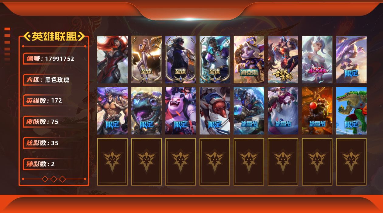 [17991752]【店主推荐捡漏号】未定级段位-172英雄-75皮肤-35炫彩-1终极-5神话-15限定-12传说-10史诗