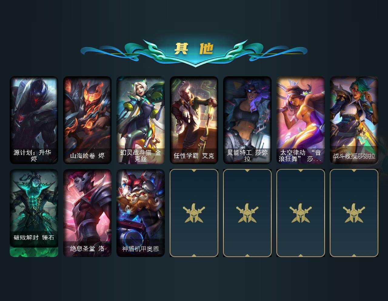 【其他皮肤】:风执事加里奥,弗拉基米尔伯爵,黎明使者莫甘娜,假面女皇伊芙琳,王子不是我阿木木,背叛之刃普朗克,塔里克辉盾,战场BOSS布里茨,幻影梦魔魔腾,荒野之咬雷克顿,银河魔装机神伊莉丝,战神阿瑞斯盖伦,战斗学院拉克丝,绒毛菲兹,禁魔石巨像诺提勒斯,咖啡甜心璐璐,黑夜使者凯隐,净雪之月凯隐,KDAALLOUT卡莎,真实伤害亚索,这货不是维克兹,源计划升华烬,山海绘卷烬,幻灵战斗猫金克丝,任性学霸艾克,灵能特工莎弥拉,太空律动音浪狂舞莎弥拉,战斗教授莎弥拉,破败解封锤石,绝息圣堂洛,神盾机甲奥恩