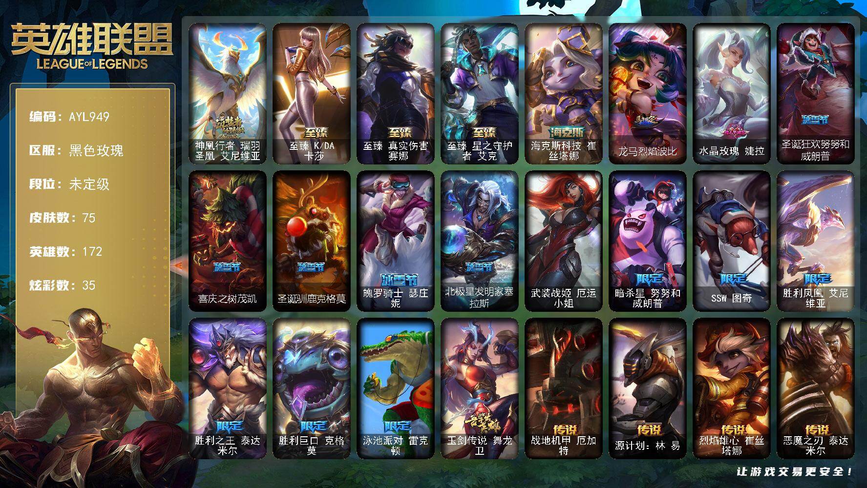 [17991752]【店主推荐捡漏号】未定级段位-172英雄-75皮肤-35炫彩-1终极-5神话-15限定-12传说-10史诗 【神话皮肤】:神凰行者瑞羽圣凰艾尼维亚 【至臻皮肤】:至臻KDA卡莎,至臻真实伤害赛娜,至臻星之守护者艾克 【海克斯皮肤】:海克斯科技崔丝塔娜 【臻彩皮肤】:无畏骑士瑟庄妮赤子初心 【年限皮肤】:龙马烈焰波比 【情人节限定】:水晶玫瑰婕拉 【冰雪限定】:圣诞狂欢努努和威朗普,喜庆之树茂凯,圣诞驯鹿克格莫,魄罗骑士瑟庄妮,北极星发明家塞拉斯 【终极皮肤】:武装战姬厄运小姐 【限定皮肤】:暗杀星努努和威朗普,SSW图奇,胜利凤凰艾尼维亚,胜利之王泰达米尔,胜利巨口克格莫,泳池派对雷克顿,玉剑传说舞龙卫 【传说皮肤】:战地机甲厄加特,源计划林易,烈焰雄心崔丝塔娜,恶魔之刃泰达米尔,魔女伊芙琳,双重冰晶艾尼维亚,电玩女神娑娜,苹果机器人布里茨,冰川巨兽墨菲特,偶像歌手阿狸,宇航员诺提勒斯,西部魔影卢锡安 【史诗皮肤】:兔宝宝提莫,五杀摇滚键盘手娑娜,三昧真火孙悟空,屠龙勇士薇恩,飞车暴走族古拉加斯,铁血女忍阿卡丽,最后一只恐龙纳尔,弗雷尔卓德塔莉垭,时之砂艾克,仲裁圣骑亚托克斯 【勇士皮肤】:烈焰猛士奥拉夫 【其他皮肤】:风执事加里奥,弗拉基米尔伯爵,黎明使者莫甘娜,假面女皇伊芙琳,王子不是我阿木木,背叛之刃普朗克,塔里克辉盾,战场BOSS布里茨,幻影梦魔魔腾,荒野之咬雷克顿,银河魔装机神伊莉丝,战神阿瑞斯盖伦,战斗学院拉克丝,绒毛菲兹,禁魔石巨像诺提勒斯,咖啡甜心璐璐,黑夜使者凯隐,净雪之月凯隐,KDAALLOUT卡莎,真实伤害亚索,这货不是维克兹,源计划升华烬,山海绘卷烬,幻灵战斗猫金克丝,任性学霸艾克,灵能特工莎弥拉,太空律动音浪狂舞莎弥拉,战斗教授莎弥拉,破败解封锤石,绝息圣堂洛,神盾机甲奥恩