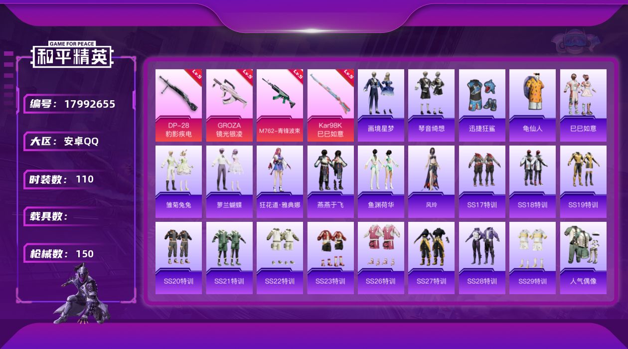 [17992655]可二次【特价出售/店主推荐】安卓 手Q-2粉装-7特效枪-1粉色飞行器-38765热力值-8王牌印记-110套装-150枪皮【热门品类】:套装-龟仙人【粉色套装】:角色-罪夜之冕,角色-虹云熊熊【粉色枪皮等级】:GROZA-镜光银凌(五级),M762-青锋波束(五级),UMP45-萌骑冒险(三级),AKS-74U-森灵之息(五级),Kar98K-巳巳如意(五级),Mk14-福马献瑞(五级),DP-28-豹影疾电(五级)【粉色枪皮】:GROZA-镜光银凌,M762-青锋波束,UMP45-萌骑冒险,AKS-74U-森灵之息,Kar98K-巳巳如意,Mk14-福马献瑞,DP-28-豹影疾电【粉色飞行器】:炫彩糖果飞行器