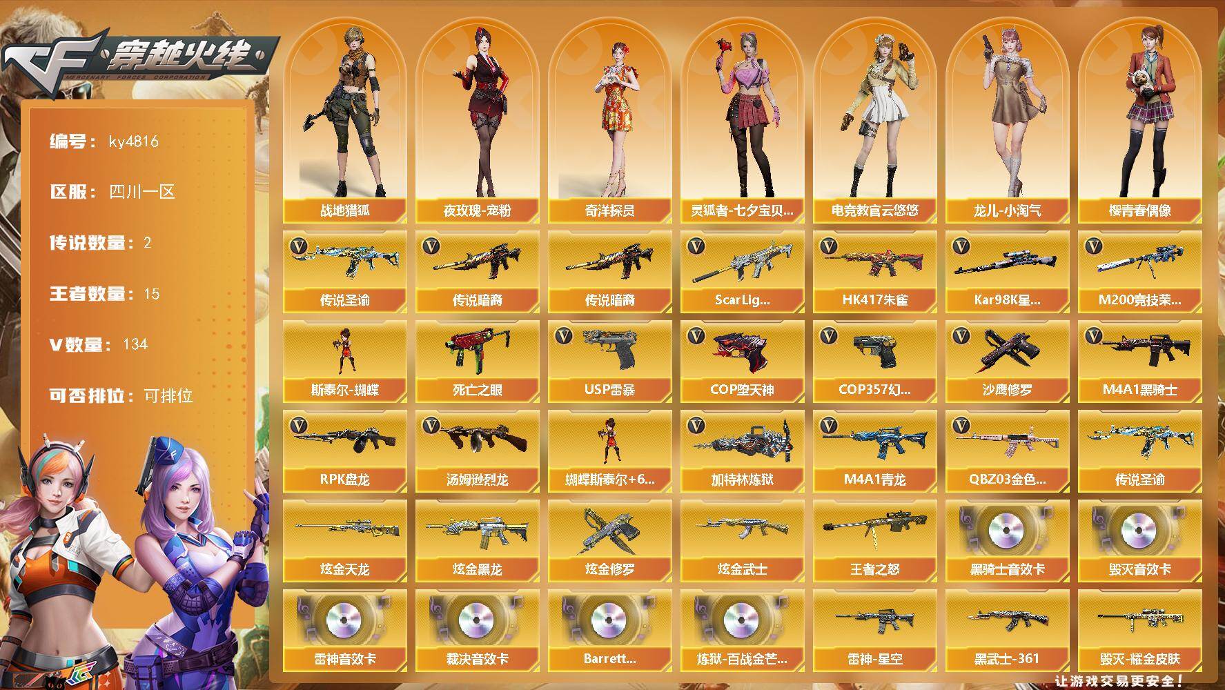 [17992905]【ky4816】四川一区-134V-15王者-5炫金 【传说武器】:传说暗裔,传说圣谕 【传说角色】:传说星骇 【热门武器】:传说暗裔,传说圣谕,QBZ03-金色蔷薇,Scar Light-白虎,HK417-朱雀,M4A1-青龙,M200-竞技荣光,死亡之眼*3,Kar98K-星神,M4A1-黑骑士,汤姆逊-烈龙*6,RPK-盘龙*6,加特林-炼狱,斯泰尔-蝴蝶,USP-雷暴,COP-堕天神,COP 357-幻灵,沙鹰-修罗*2 【王者炫金武器】:王者之怒,炫金黑龙,炫金武士,炫金天龙,炫金修罗*2 【音效卡】:M4A1-雷神音效卡,M4A1-黑骑士音效卡,Barrett-毁灭音效卡,AWM-裁决音效卡,Barrett-碧霄极光音效卡,炼狱-百战金芒-庆典舞曲音效卡 【皮肤】:白虎-热带奇洋 皮肤,金色蔷薇-热带奇洋 皮肤,星神-璀璨皮肤,星神-漫游,烈龙-星空,雷神-能量核心,雷神-星空,雷神-宠儿-2019MVP,雷神-春花弄影 皮肤,M4A1-再燃火线,火麒麟-平天大圣,火麒麟-百城,毁灭耀金皮肤,毁灭-战神张飞,毁灭-BEAN-2020MVP,毁灭-英雄计划 皮肤,黑龙-能量核心,黑龙-暗月,黑龙-墨子皮肤,黑骑士-地狱火,AK47-黑武士-361,战神-粉色甜心皮肤*2,战神-紫绶金章皮肤,极光-能量核心,修罗-能量核心,屠龙-荣耀之锋,屠龙-星火燎原*3,轻型军用手斧-再燃火线,擎天-秘银 【角色】:魅影,春,凌霄,电竞教官-云悠悠,战地猎狐,王者-瞳-闭月羞花,王者-魅影,奇洋探员,空,风暴女,灵狐者-X,灵狐者-七夕宝贝,龙儿-小淘气,蜀雪,新灵狐者,新娜塔莎,夜玫瑰-宠粉,樱-青春偶像,影武者-X 【人偶武器】:天龙-曼陀罗,火麒麟-灵狐,M4A1-雷神-精英刀锋,斯泰尔-蝴蝶,MAC-10-千针棘鲨,AWM-灵狐-15周年嘉年华,COP-旗袍*2,迷你深渊冰龙,迷你牛牛,迷你生化手雷 【暴走生化】:死亡之眼*3 【挑战大师】:神圣爆裂者III,AK47-冰龙粉碎者,VEPR-12-金魔,激光毁灭者III,试炼破坏者III,KAC-圣炎切割者III,神圣爆裂者-末日III,阐释者III*2 【英雄级武器】:AK47-火麒麟,M4A1-黑龙,M4A1-雷神,M4A1-黑骑士,AK47-雷暴,M4A1-青龙,HK417-朱雀,Scar Light-白