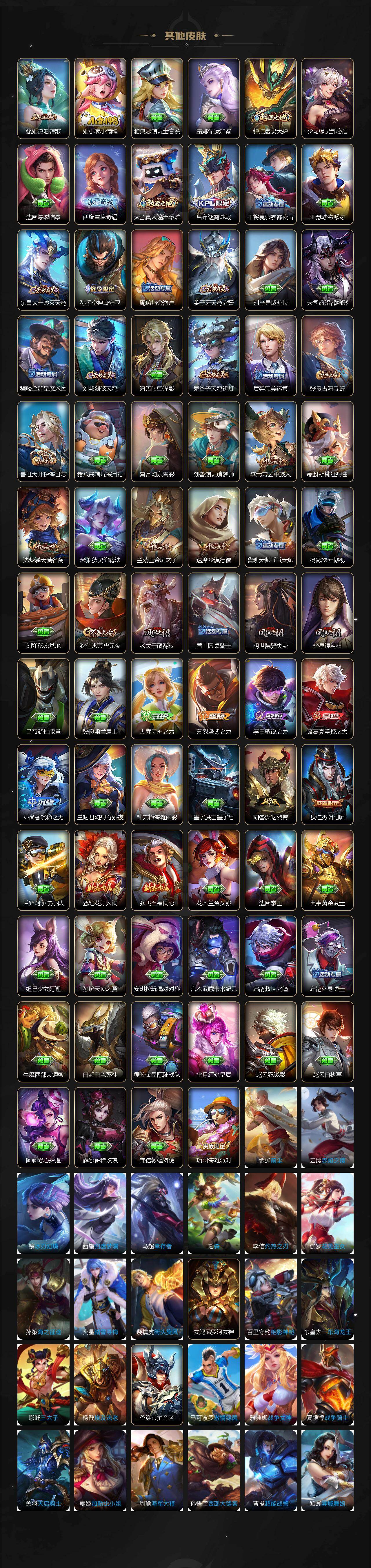 【其他皮肤】:吕布舞狮寰,兰陵王雾影缉谜,鲁班七号班班快跑,妲己线条小狗,桑启线条小狗,蒙恬苍云破阵,安琪拉糖果风暴,鬼谷子谜偶窥秘,虞姬溯影追猎,曹操逐霄之志,亚瑟荣光之誓,哪吒罗小黑战记,甄姬逆浪荇歌,姬小满小满鸭,雅典娜潮玩士官长,露娜命运加冕,钟馗虚灵犬护,少司缘灵卦秘语,达摩爆裂喵拳,西施雪境奇遇,太乙真人谧流熔炉,吕布逐霄战戟,干将莫邪雾都夜雨,亚瑟动物派对,东皇太一噬灭天穹,孙悟空神迹守卫,周瑜熔金海岸,姜子牙天穹之誓,刘备异域游侠,大司命暗都幽影,程咬金群星魔术团,刘邦剑破天穹,海诺时空谍影,鬼谷子天穹祈灯,后羿完美运算,张良古海寻踪,鲁班大师探海日志,猪八戒潮玩探月行,海月幻泉雾影,刘备潮玩造梦师,李元芳云中旅人,蒙犽胡桃狂想曲,沈梦溪大漠名商,米莱狄契约魔法,兰陵王金庭之子,达摩沙漠行僧,鲁班大师乓乓大师,杨戬次元傲视,刘禅秘密基地,狄仁杰万华元夜,老夫子