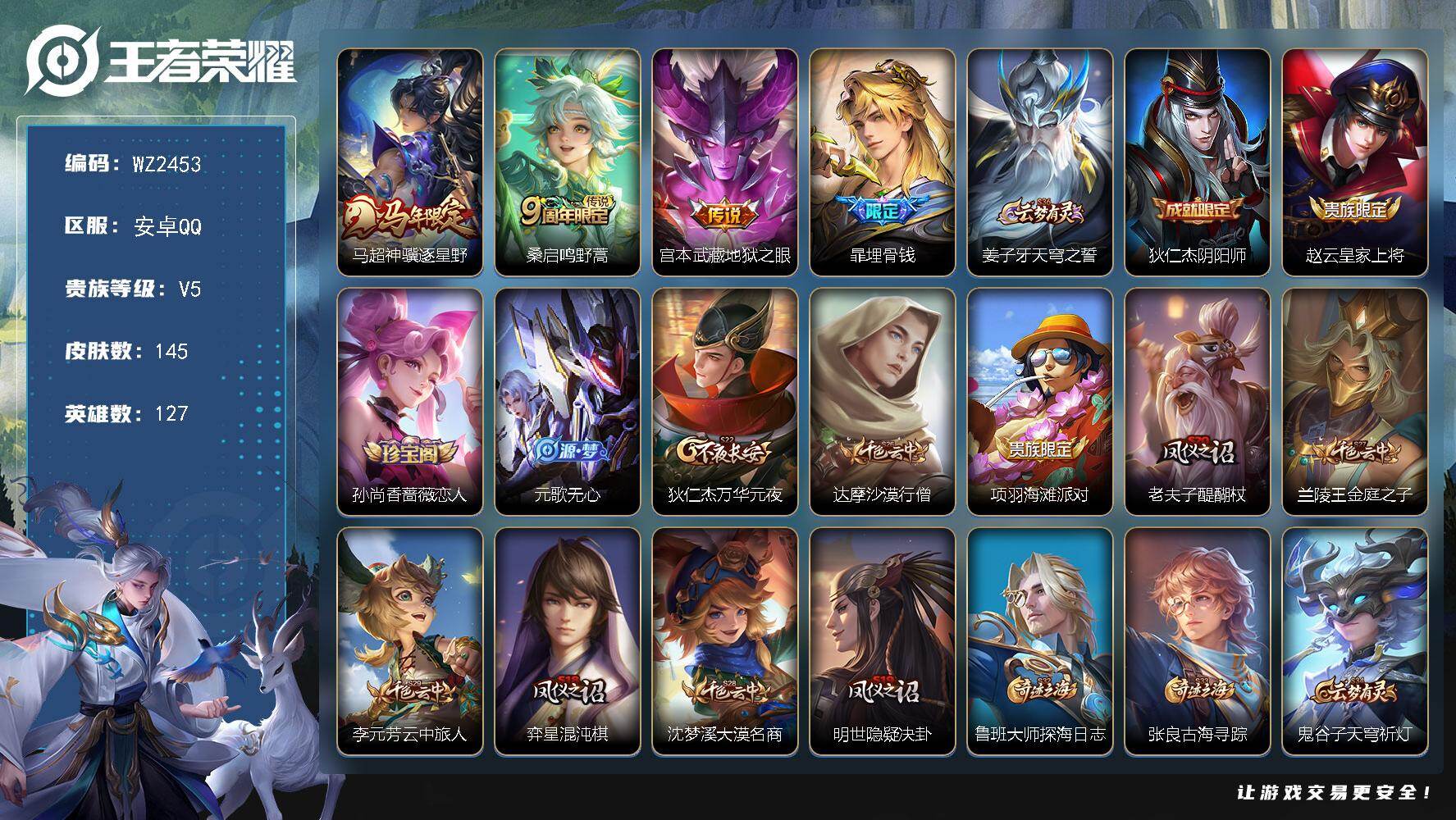 [17993773]安卓Q-145皮肤-3传说-26史诗 【传说皮肤】:马超神骥逐星野,桑启鸣野蒿,宫本武藏地狱之眼 【限定皮肤】:暃埋骨钱,姜子牙天穹之誓,狄仁杰阴阳师,赵云皇家上将,孙尚香蔷薇恋人,元歌无心,狄仁杰万华元夜,达摩沙漠行僧,项羽海滩派对,老夫子醍醐杖,兰陵王金庭之子,李元芳云中旅人,弈星混沌棋,沈梦溪大漠名商,明世隐疑决卦,鲁班大师探海日志,张良古海寻踪,鬼谷子天穹祈灯,刘邦剑破天穹,程咬金群星魔术团,刘备异域游侠,周瑜熔金海岸 【赛季限定】:弈星混沌棋,明世隐疑决卦,老夫子醍醐杖,狄仁杰万华元夜,达摩沙漠行僧,兰陵王金庭之子,沈梦溪大漠名商,李元芳云中旅人,鲁班大师探海日志,张良古海寻踪,鬼谷子天穹祈灯,刘邦剑破天穹,姜子牙天穹之誓,东皇太一噬灭天穹,太乙真人谧流熔炉,钟馗虚灵犬护,甄姬逆浪荇歌,亚瑟荣光之誓,牛魔星界战将 【战令限定】:亚连破空之剑,孙悟空神迹守卫,周瑜线条小狗,小乔线条小狗 【史诗皮肤】:周瑜线条小狗,小乔线条小狗,公孙离涂山容容,狂铁龙之律动,牛魔星界战将,艾琳陌上桑,亚连破空之剑,暃埋骨钱,黄忠怒海争锋,元歌无心,貂蝉唤灵魅影,橘右京修罗,狄仁杰鹰眼统帅,伽罗箭羽风息,孙策猫狗日记,铠曙光守护者,百里守约特工魅影,兰陵王暗隐猎兽者,花木兰水晶猎龙者,李白千年之狐,曹操幽灵船长,妲己魅力维加斯,嬴政暗夜贵公子,孙尚香蔷薇恋人,宫本武藏鬼剑武藏,赵云未来纪元,赵云皇家上将 【其他皮肤】:吕布舞狮寰,兰陵王雾影缉谜,鲁班七号班班快跑,妲己线条小狗,桑启线条小狗,蒙恬苍云破阵,安琪拉糖果风暴,鬼谷子谜偶窥秘,虞姬溯影追猎,曹操逐霄之志,亚瑟荣光之誓,哪吒罗小黑战记,甄姬逆浪荇歌,姬小满小满鸭,雅典娜潮玩士官长,露娜命运加冕,钟馗虚灵犬护,少司缘灵卦秘语,达摩爆裂喵拳,西施雪境奇遇,太乙真人谧流熔炉,吕布逐霄战戟,干将莫邪雾都夜雨,亚瑟动物派对,东皇太一噬灭天穹,孙悟空神迹守卫,周瑜熔金海岸,姜子牙天穹之誓,刘备异域游侠,大司命暗都幽影,程咬金群星魔术团,刘邦剑破天穹,海诺时空谍影,鬼谷子天穹祈灯,后羿完美运算,张良古海寻踪,鲁班大师探海日志,猪八戒潮玩探月行,海月幻泉雾影,刘备潮玩造梦师,李元芳云中旅人,蒙犽胡桃狂想曲,沈梦溪大漠名商,米莱狄契约魔法,兰陵王金庭之子,达摩沙漠行僧,鲁班大师乓乓大师,杨戬次元傲视,刘禅秘密基地,狄仁杰万华元夜,老夫子