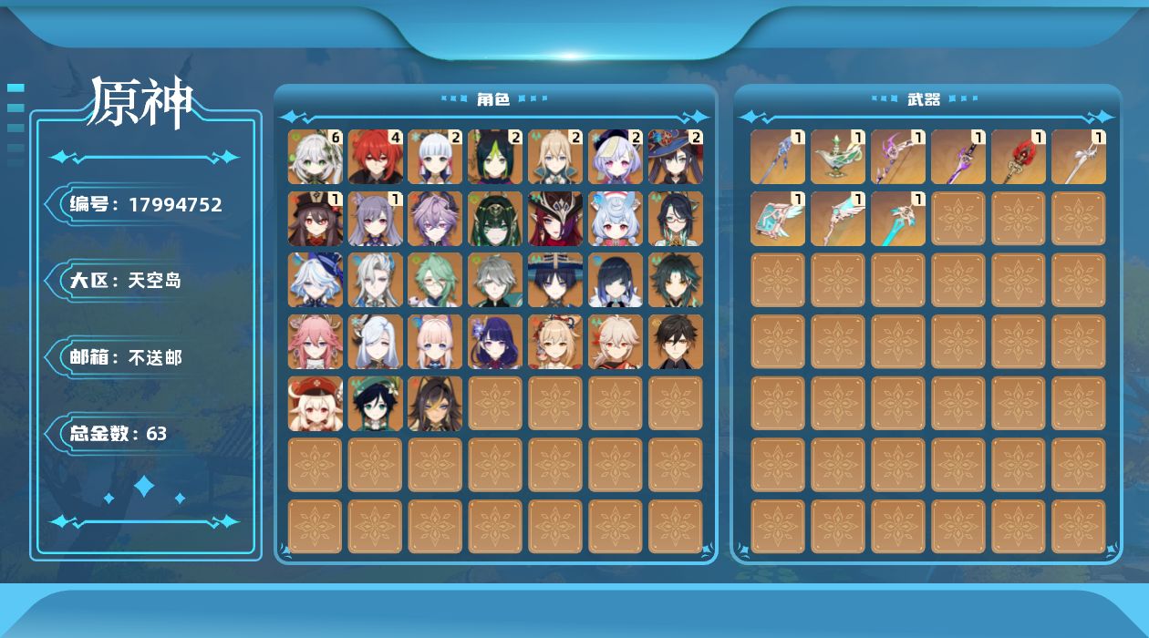 0命希格雯,0命闲云,0命芙宁娜,0命那维莱特,0命白术,0命迪希雅,0命艾尔海森,0命流浪者,满命纳西妲,2命提纳里,0命夜兰,0命八重神子,0命申鹤,0命雷电将军,0命枫原万叶,2命神里绫华,0命钟离,1命胡桃,0命魈,0命宵宫,0命温迪,0命可莉,0命珊瑚宫心海,1命刻晴,2命七七,2命琴,2命莫娜,4命迪卢克,0命恰斯卡,0命奈芙尔,0命杜林,精1千夜浮梦,精1飞雷之弦振,精1雾切之回光,精1护摩之杖,精1天空之翼,精1天空之刃,精1天空之卷,精1风鹰剑,精1血染荒城