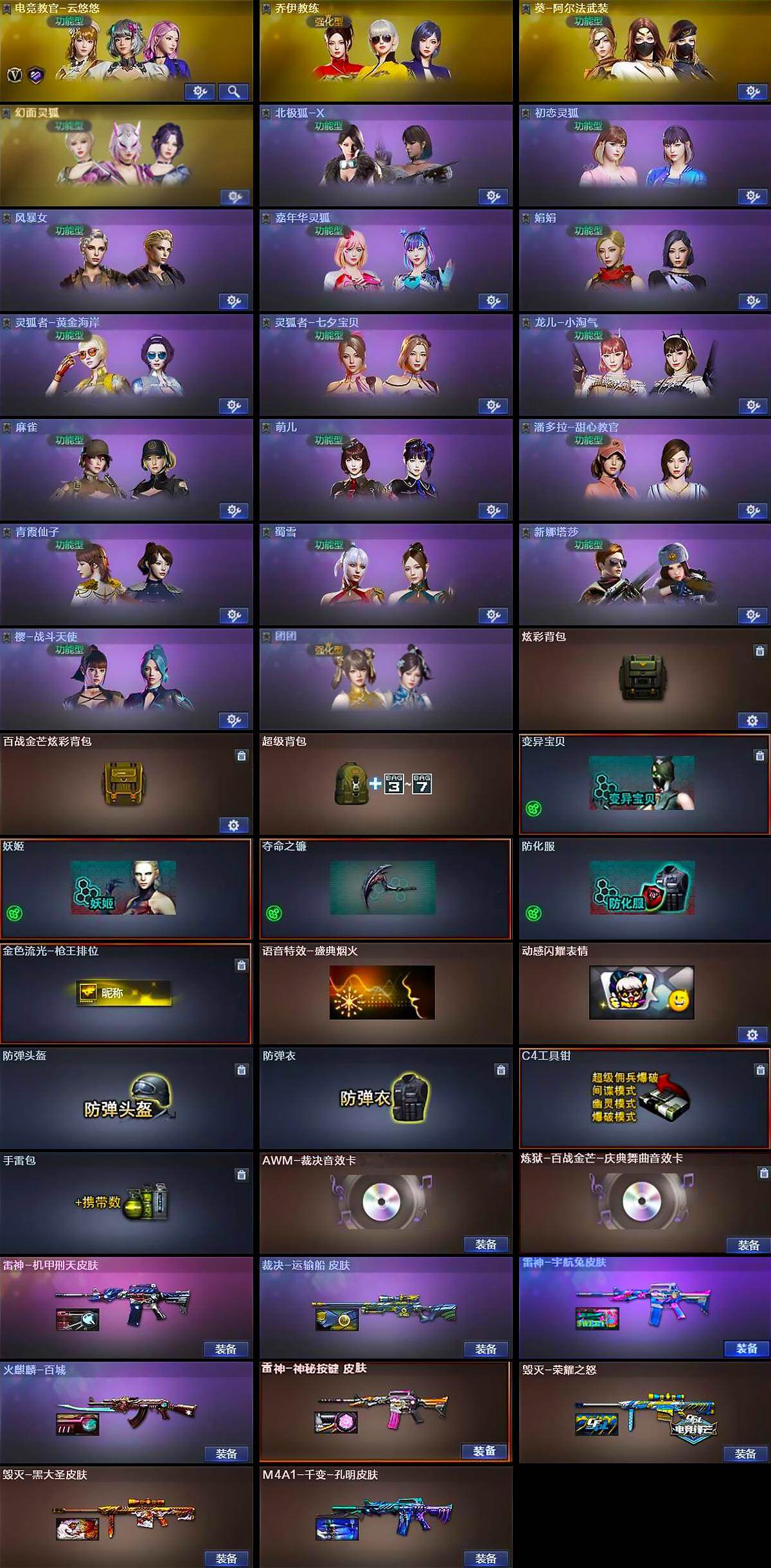 【道具】:炫彩背包,百战金芒炫彩背包,超级背包,变异宝贝,妖姬,夺命之镰,防化服,金色流光-枪王排位,语音特效-盛典烟火,动感闪耀表情,防弹头盔,防弹衣,C4工具钳,手雷包