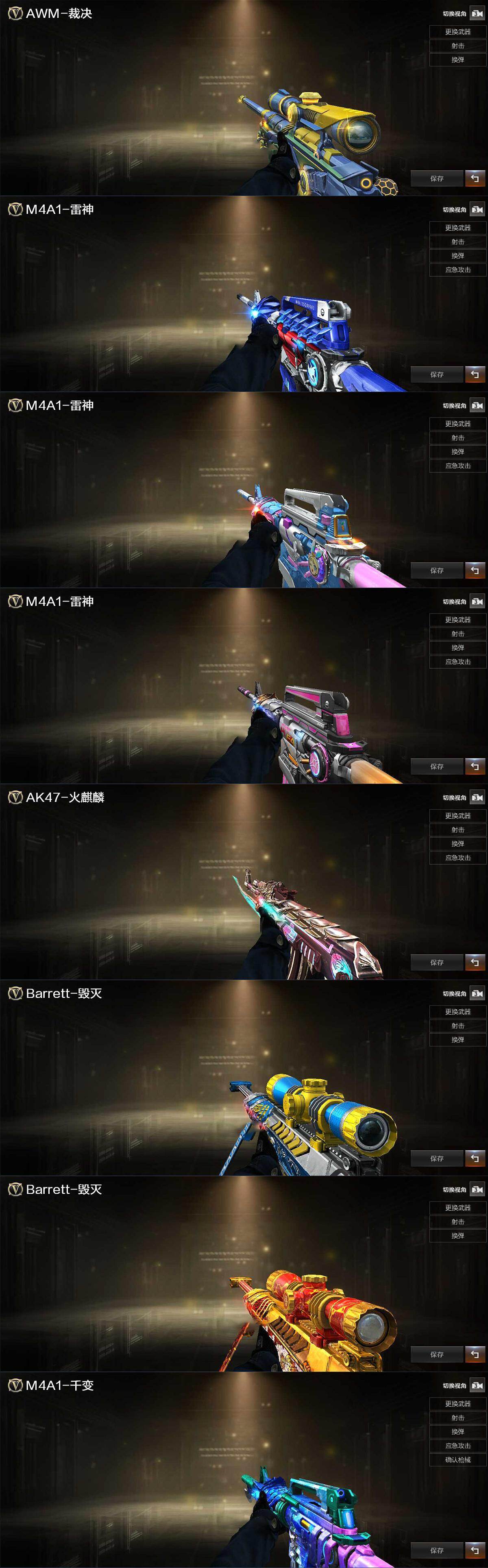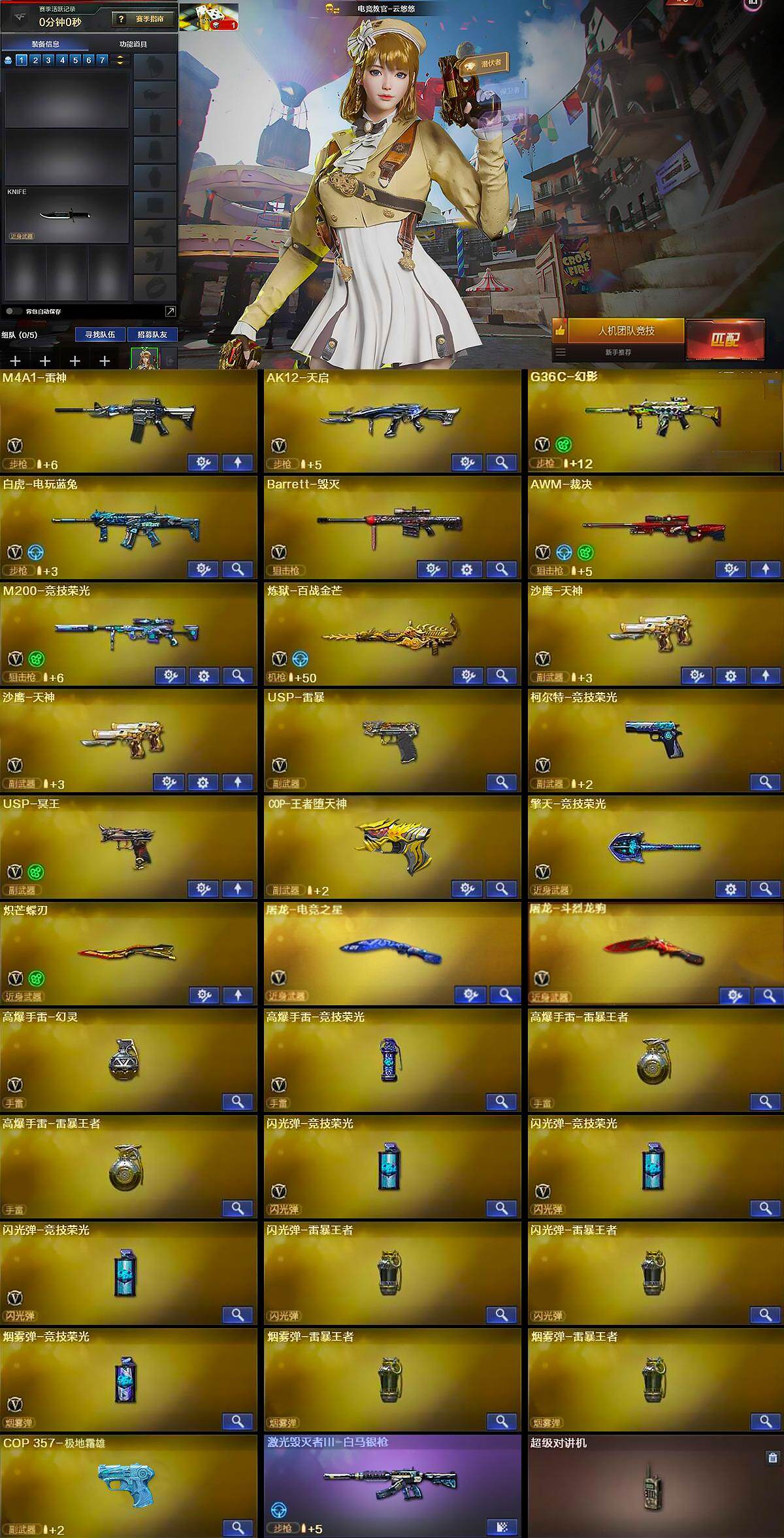 【英雄级武器】:M4A1-雷神,AK12-天启,G36C-幻影,白虎-电玩蓝兔,Barrett-毁灭,AWM-裁决,M200-竞技荣光,炼狱-百战金芒,沙鹰-天神*2,USP-雷暴,柯尔特-竞技荣光,USP-冥王,擎天-竞技荣光,炽芒蝶刃,屠龙-电竞之星,屠龙-斗烈龙驹,高爆手雷-幻灵,高爆手雷-竞技荣光,高爆手雷-雷暴王者*2,闪光弹-竞技荣光*3,闪光弹-雷暴王者*2,烟雾弹-竞技荣光,烟雾弹-雷暴王者*2